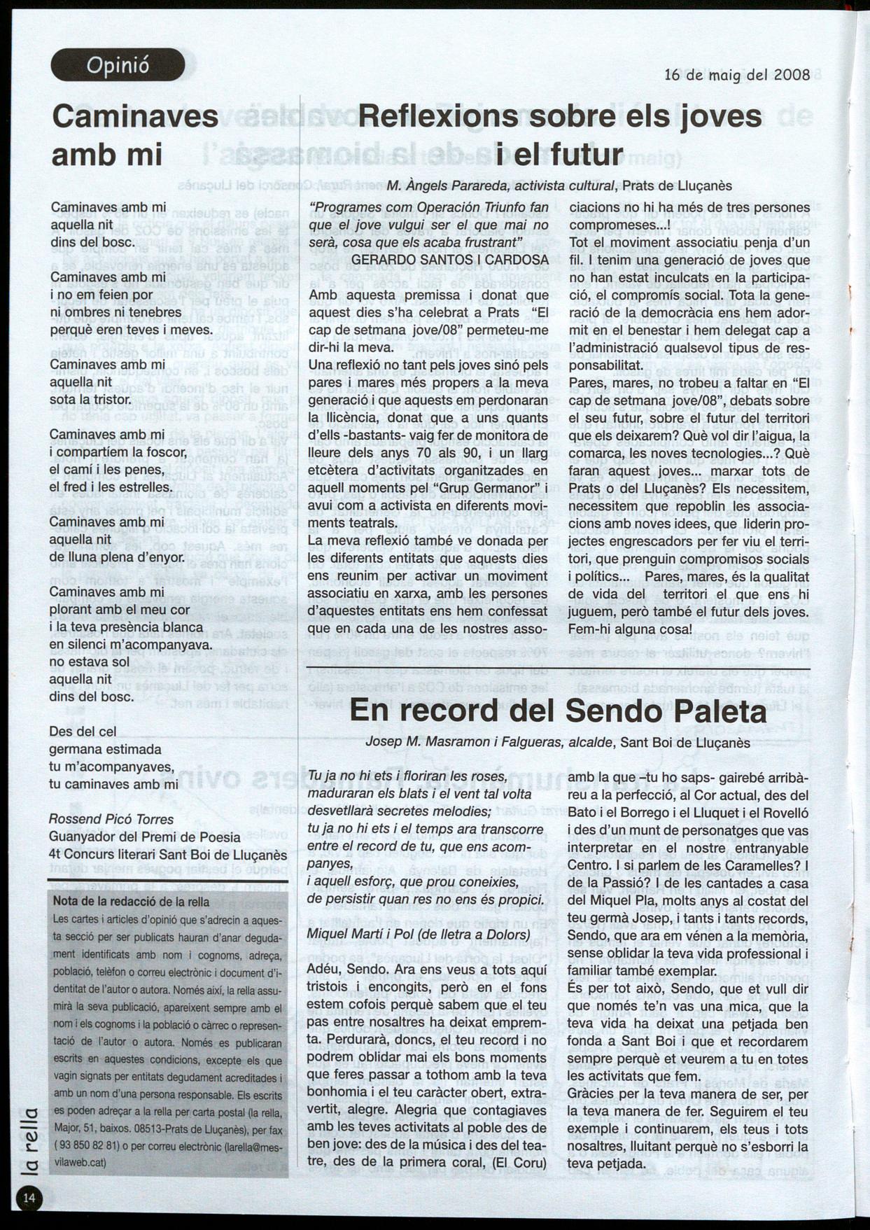 Adéu, Senda. Ara ens veus a tots aquí tristois encongits, però en el fons estem cofois perquè sabem que el teu pas entre nosaltres ha deixat empremta. Perdurarà, doncs, el teu record i no podrem oblidar mai els bons moments que feres passar a tothom 'amb la teva bonhomia el teu caràcter obert, extravertit, alegre. Alegria que contagiaves amb les teves activitats al poble des de ben jove: des de la música i des del teatre, des de la primera coral, (El Coru)