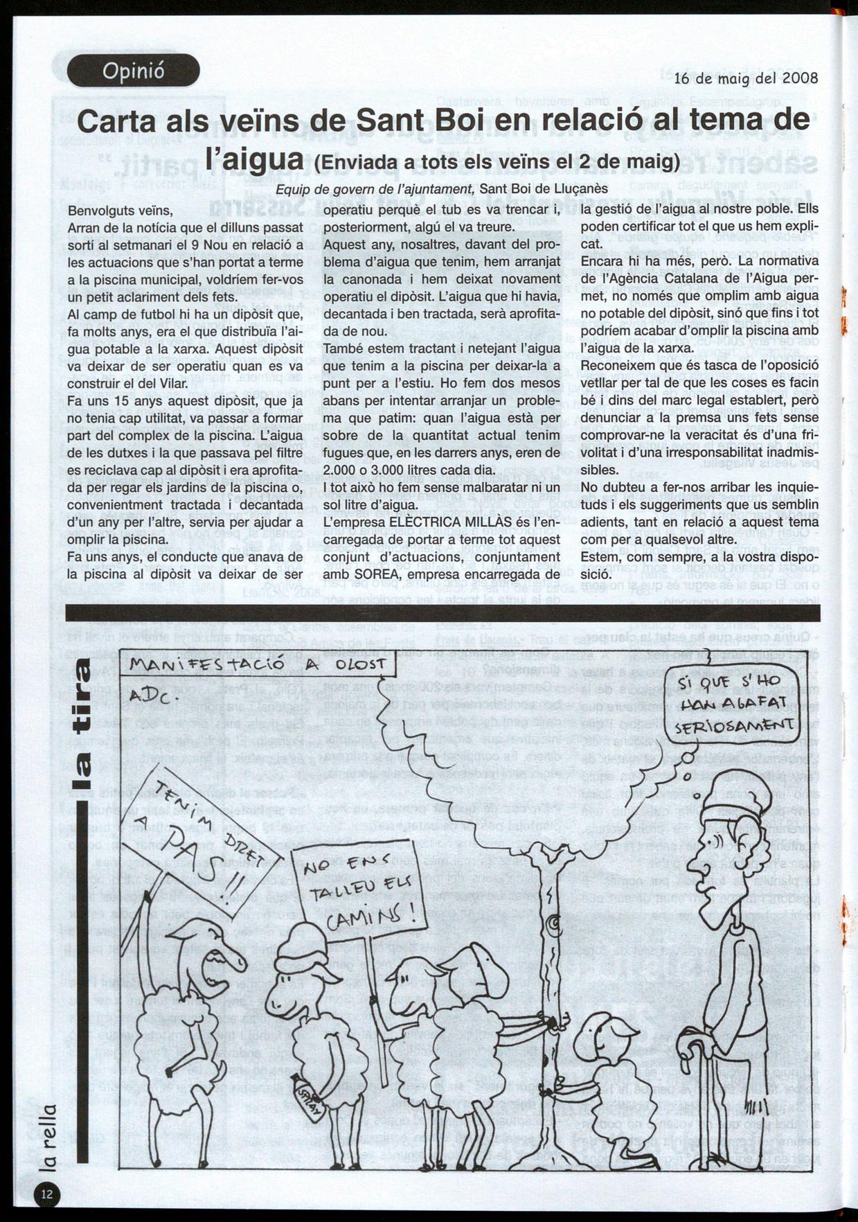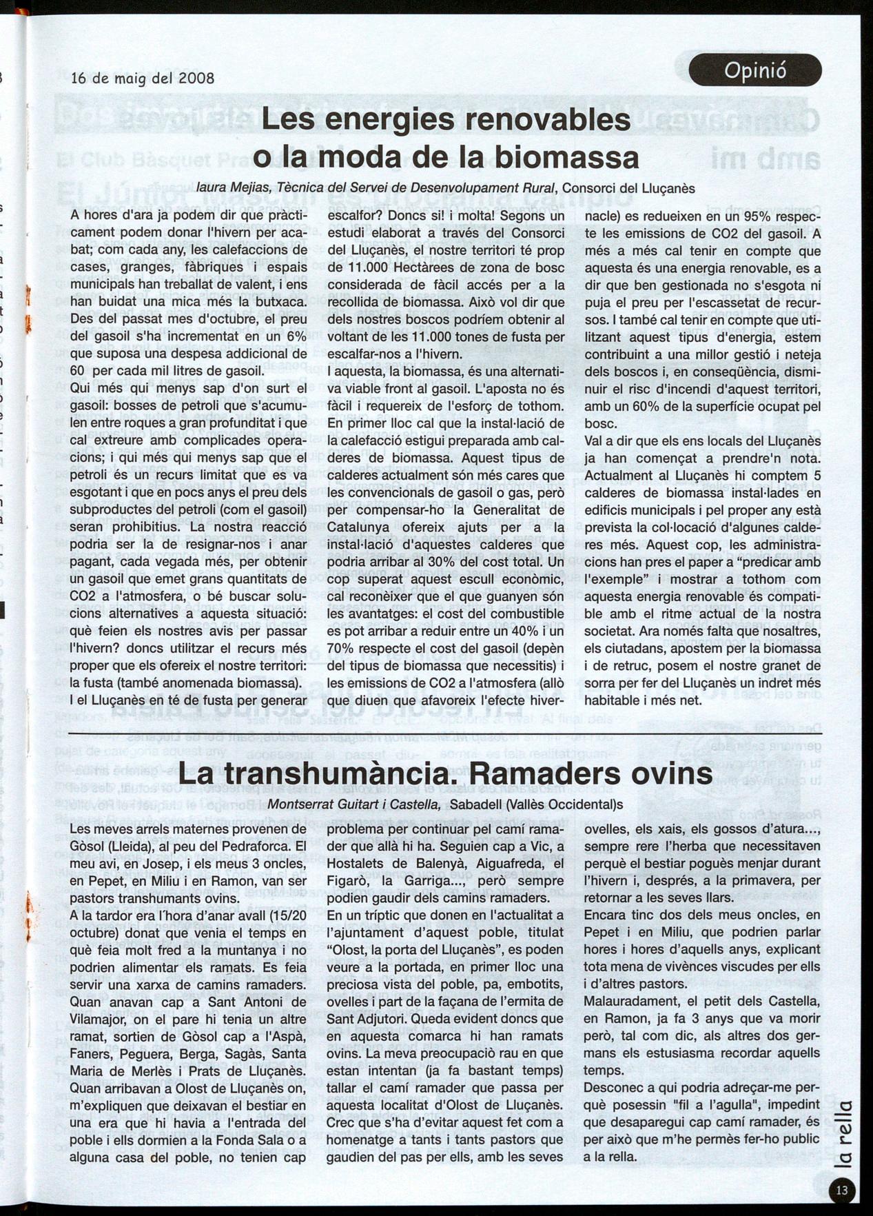 s'havia posicionat sobre el terna.En aquest article reproduïm una nota que ens ha fet arribar el pastor convocant dels actes del dissabte a la secció d'opinió publiquem una carta d'una lectora que demana la protecció dels camins ramaders. A. Cardona