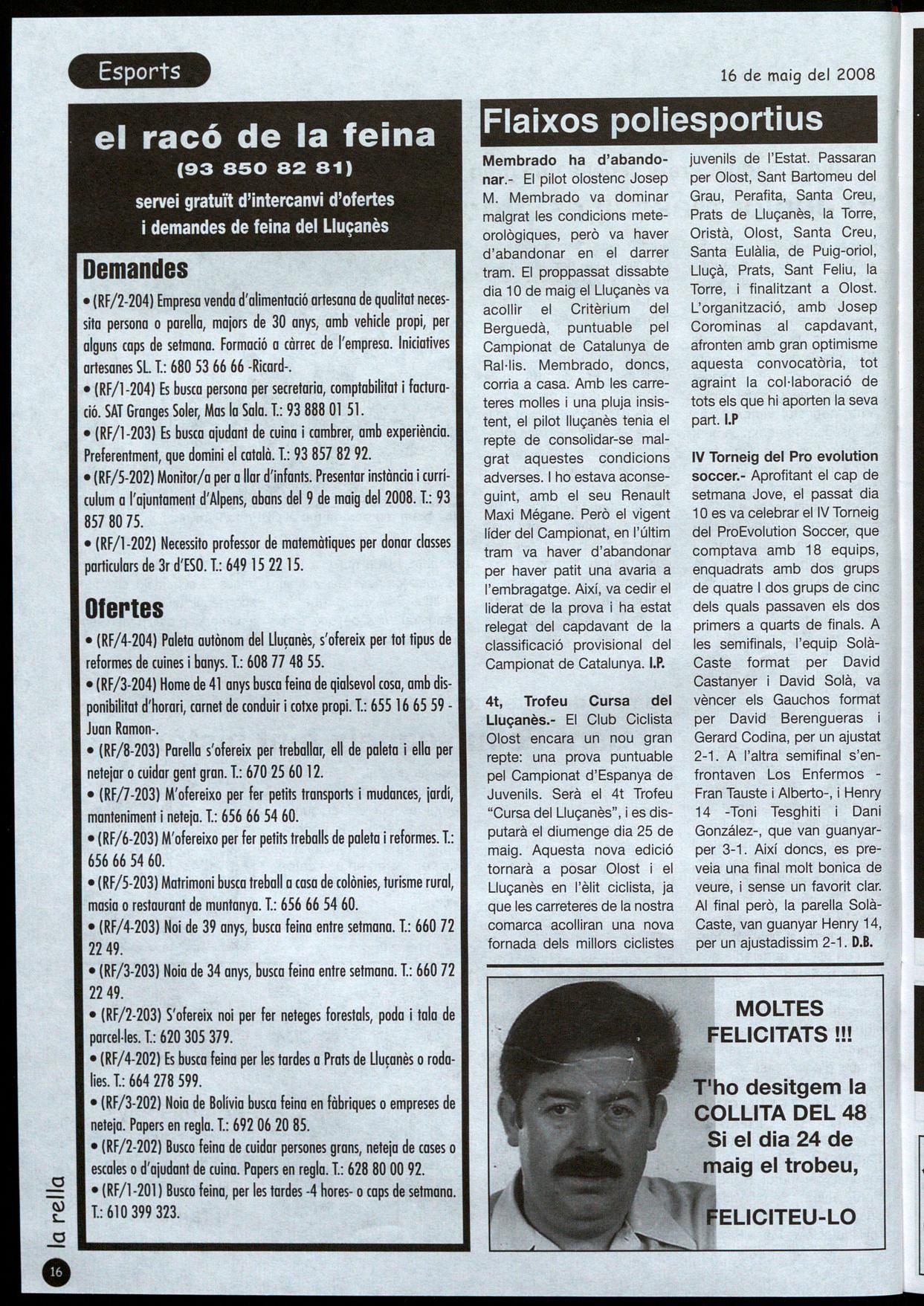 Membrado ha d'abandonar.- El pilot olostenc Josep M. Membrado va dominar malgrat les condicions meteorològiques, però va haver d'abandonar en el darrer tram. El proppassat dissabte dia 10 de maig el Lluçanès va acollir el Critèrium del Berguedà, puntuable pel Campionat de Catalunya de Ral·lis. Membrado, dones, corria a casa. Amb les carreteres molles una pluja insistent, el pilot lluçanès tenia el repte de consolidar-se malgrat aquestes condicions adverses. I ho estava aconseguint, amb el seu Renault Maxi Mégane. Però el vigent líder del Campionat, en l'últim tram va haver d'abandonar per haver patit una avaria a l'embragatge. Així, va cedir el liderat de la prova i ha estat relegat del capdavant de la classiñcació provisional del Campionat de Catalunya. I.P.