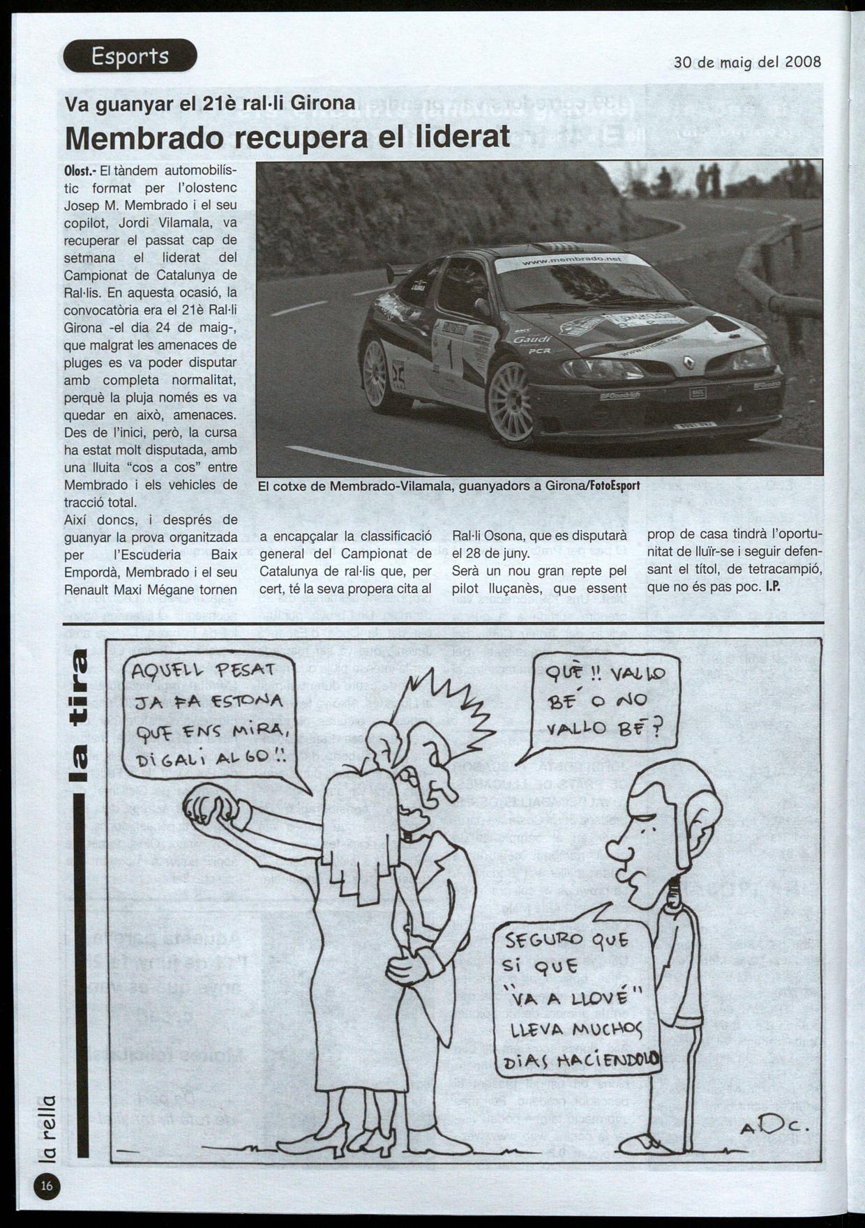 Josep M. Membrado el seu copilot, Jordi Vilamala, va recuperar el passat cap de setmana el liderat del Campionat de Catalunya de Ral·lis. En aquesta ocasió, la convocatòria era el 21 è Ral·li Girona -el dia 24 de maig-, que malgrat les amenaces de pluges es va poder disputar amb completa normalitat, perquè la pluja només es va quedar en això, amenaces. Des de l'inici, però, la cursa ha estat molt disputada, amb una lluita "cos a cos" entre Membrado els vehicles de El cotxe de Membrado-Vilamala, guanyadors a GironalFotoEsport tracció total.