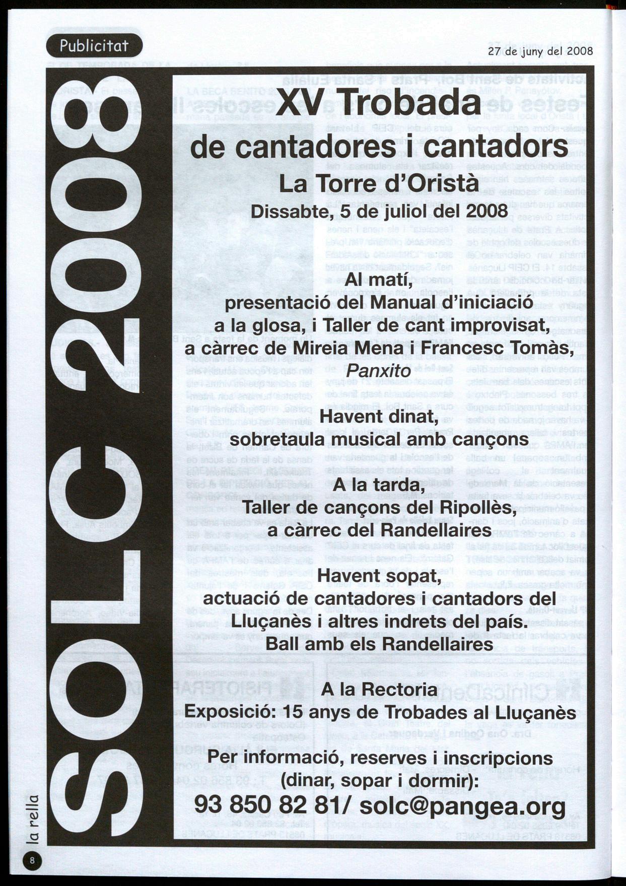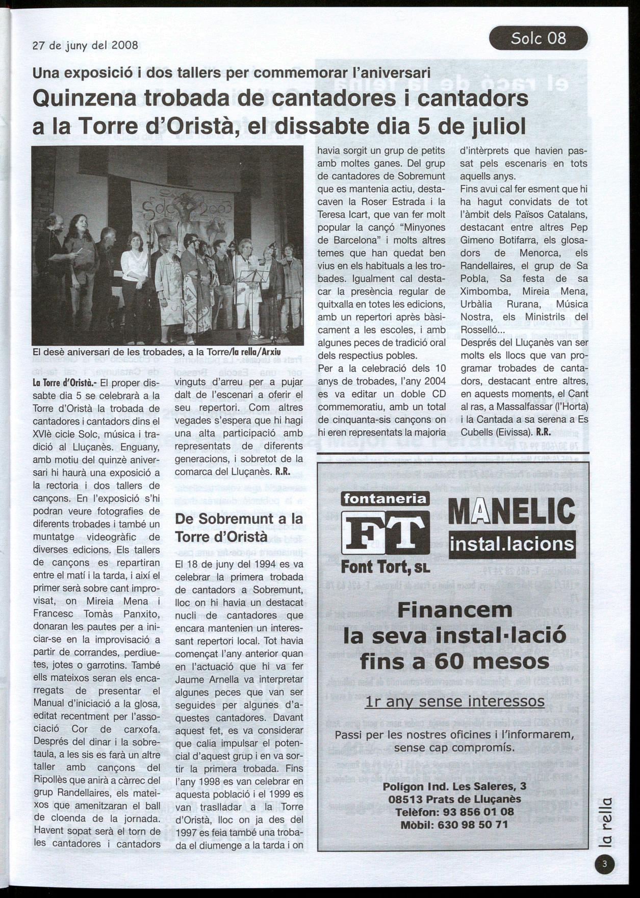 La Torre d'Oristà.- El proper dissabte dia 5 se celebrarà a la Torre d'Oristà la trobada de cantadores cantadors dins el XVlè cicie Solc, música i tradició al Lluçanès. Enguany, amb motiu del quinzè aniversari hi haurà una exposició a la rectoria dos tallers de cançons. En l'exposició s'hi podran veure fotografies de diferents trobades també un muntatge videogràfic de diverses edicions. Els tallers de cançons es repartiran entre el matí i la tarda, i així el primer serà sobre cant improvisat, on Mireia Mena Francesc Tomàs Panxito, donaran les pautes per a iniciar-se en la improvisació a partir de corrandes, perdiuetes, jotes o garrotins. També ells mateixos seran els encarregats de presentar el Manual d'iniciació a la glosa, editat recentment per l'associacio Cor de carxofa. Després del dinar la sobretaula, a les sis es farà un altre taller amb cançons del Ripollès que anirà a càrrec del grup Randellaires, els mateixos que amenitzaran el ball de cloenda de la jornada. Havent sopat serà el torn de les cantadores cantadors