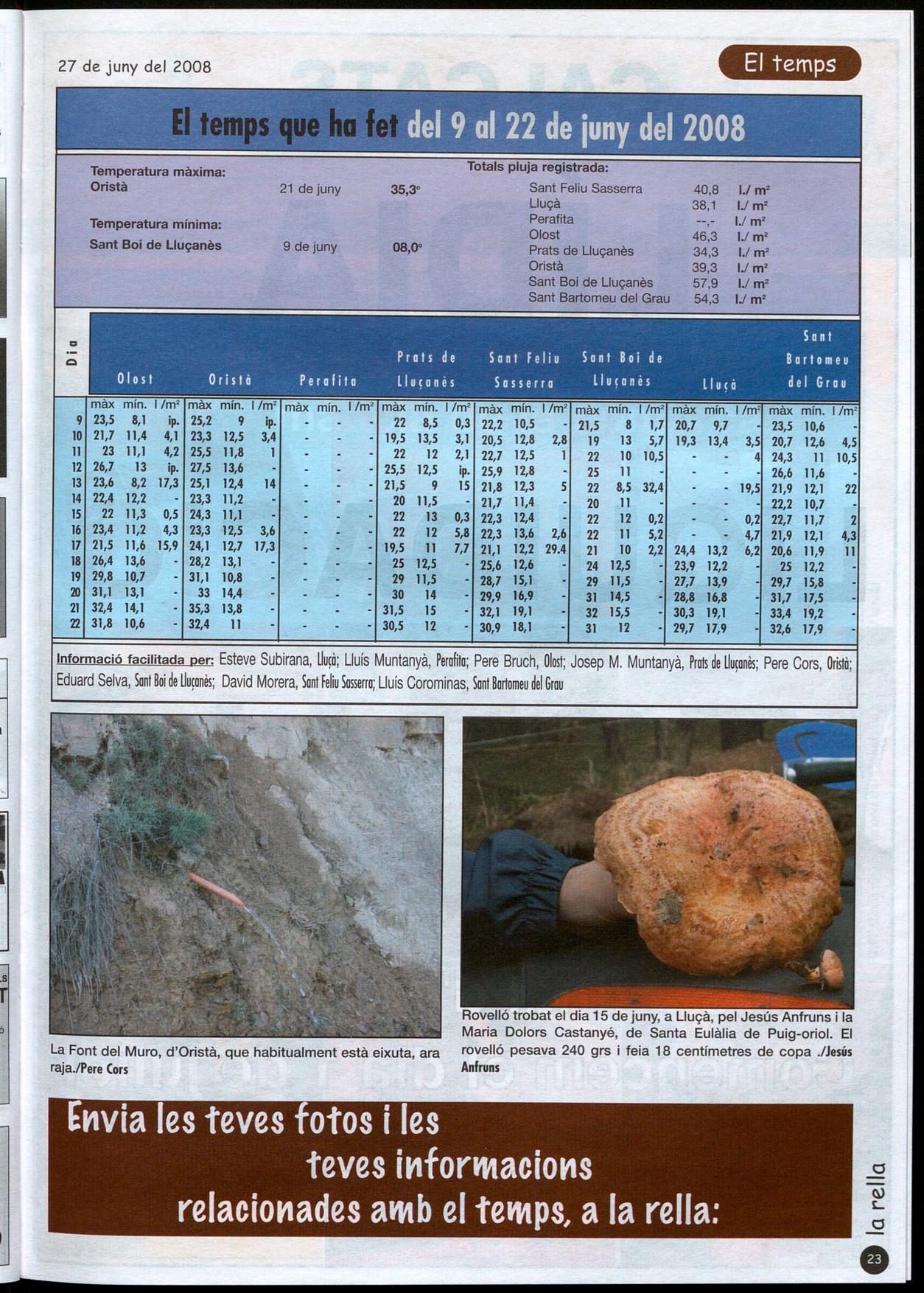 Rovelló trobat el dia 15 de juny, a Lluçà, pel Jesús Anfruns la Maria Dolors Castanyé, de Santa Eulàlia de Puig-oriol. El rovelló pesava 240 grs feia 18 centímetres de copa .lJesÚs Anfruns