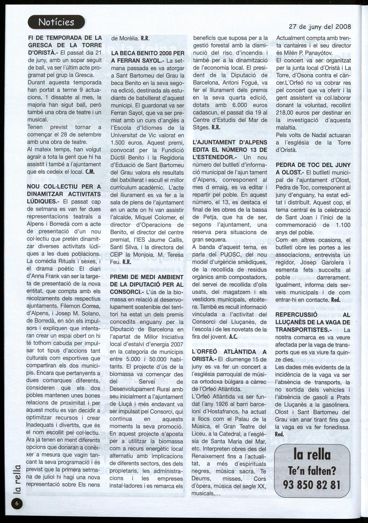 EDITA EL NÚMERO 13 DE L'ESTENEDOR.- Un nou número del butlletí d'informació municipal de I'ajun tament d'Alpens, corresponent al mes d emaig, es va editar repartir pel poble. En aquest número, el 13, es destaca el final de les obres de la bassa de Petja, que ha de ser, segons l'ajuntament, una reserva pera situacions de gran sequera.