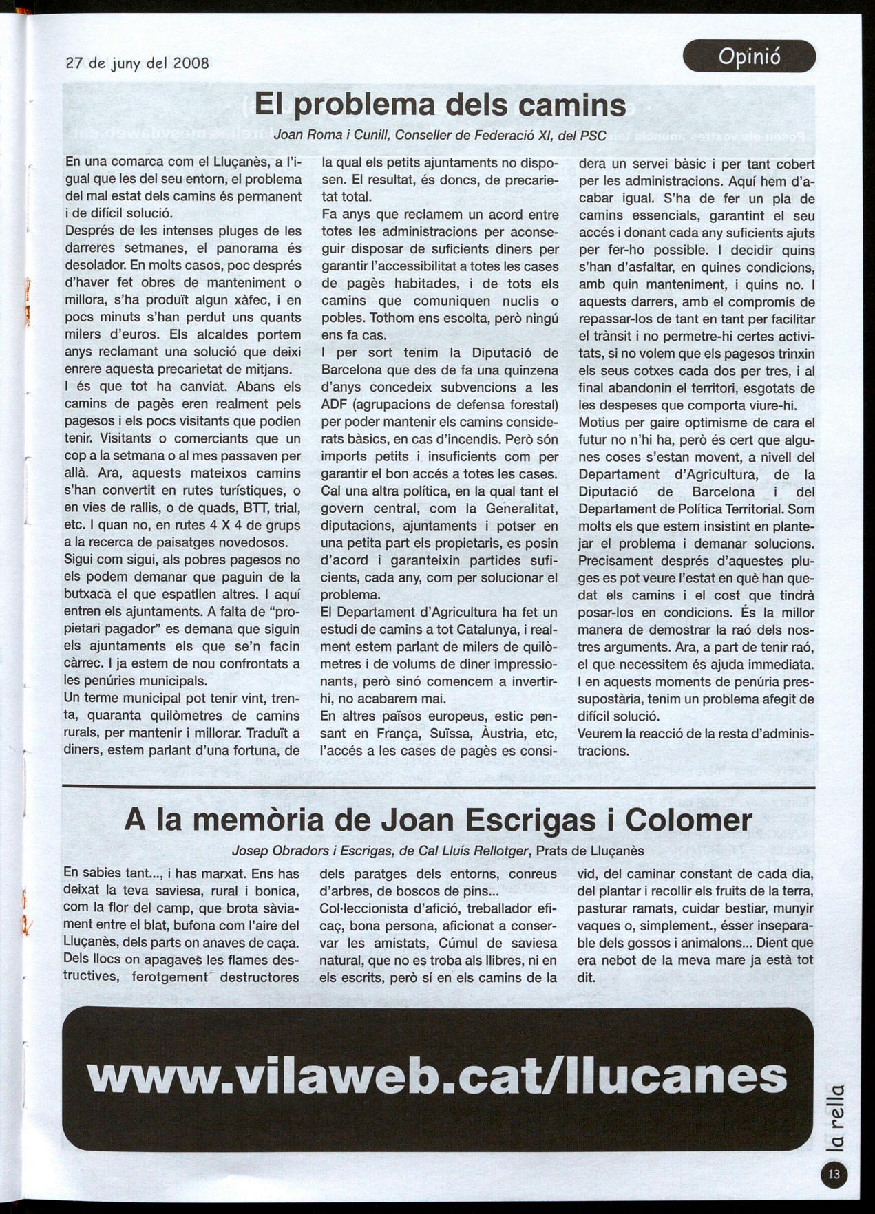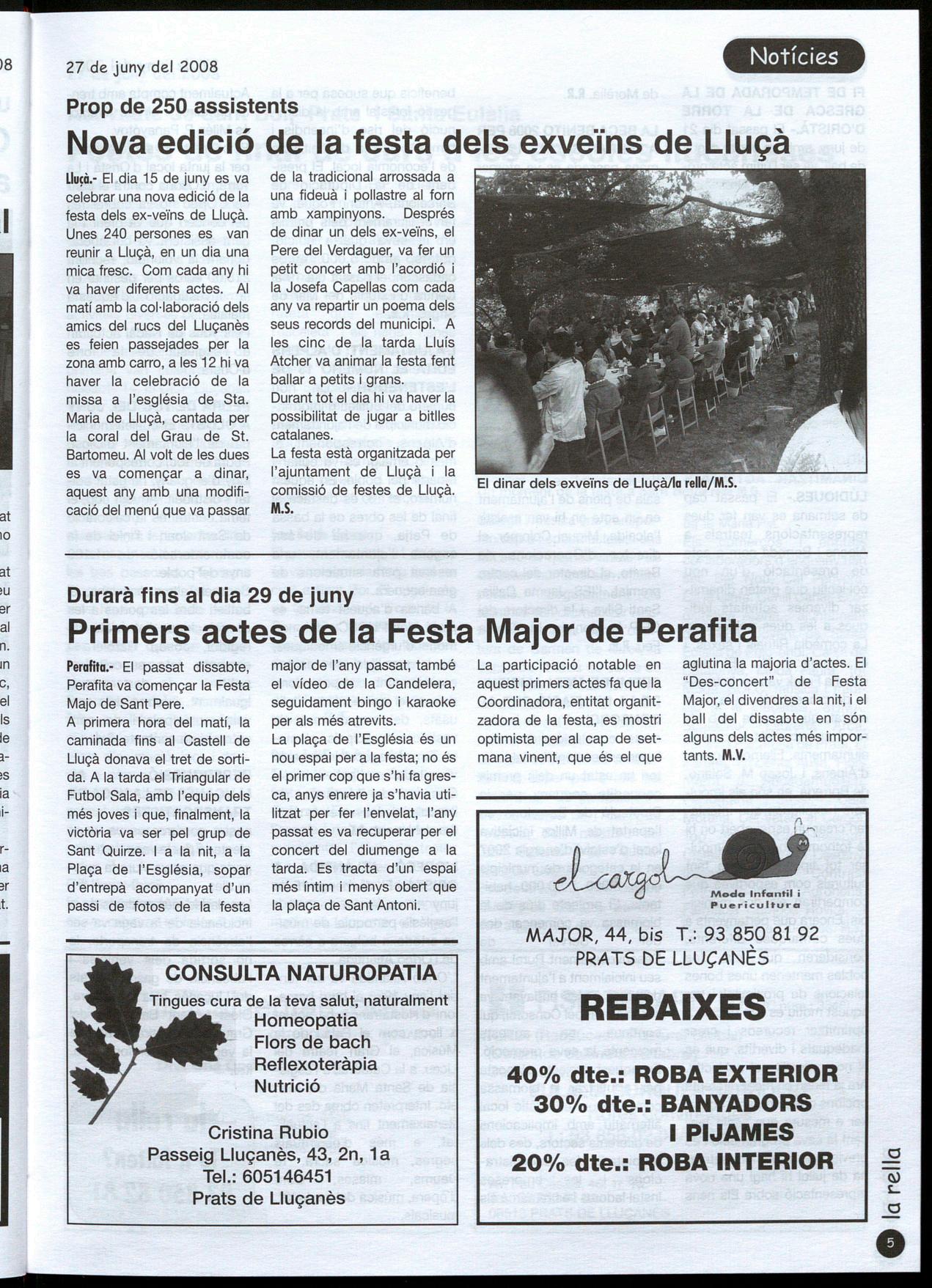 Llu�à." El dia 15 de juny es va celebrar una nova edició de la festa dels ex-veïns de Lluçà. Unes 240 persones es van reunir a Lluçà, en un dia una mica fresc. Com cada any hi va haver diferents actes. AI matí amb la col·laboració dels amics del rucs del Lluçanès es feien passejades per la zona amb carro, a les 12 hi va haver la celebració de la missa a l'església de Sta. Maria de Lluçà, cantada per la coral del Grau de St. Bartomeu. AI volt de les dues es va començar a dinar, aquest any amb una modificació del menú que va passar