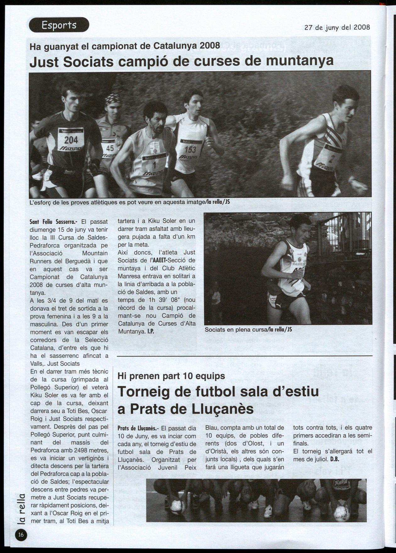 Sant Feliu Sasserra. - El passat diumenge 15 de juny va tenir lloc la III Cursa de SaldesPedraforca organitzada pe l'Associació Mountain Runners del Berguedà i que en aquest cas va ser Campionat de Catalunya 2008 de curses d'alta muntanya.