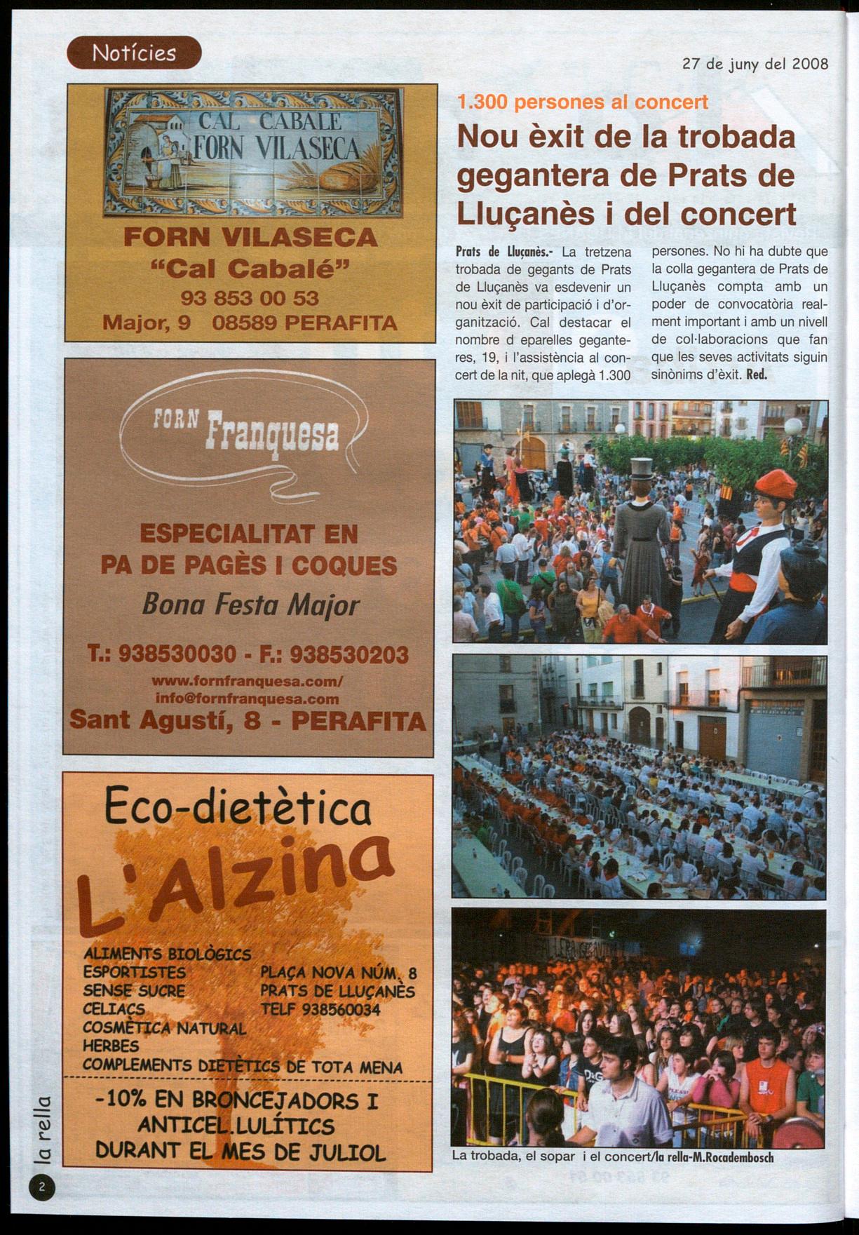Prats de Lluçanès.- La tretzena persones. No hi ha dubte que trobada de gegants de Prats la colla gegantera de Prats de de Lluçanès va esdevenir un Lluçanès compta amb un nou èxit de participació i d'or- poder de convocatòria realganització. Cal destacar el ment important i amb un nivell nombre d eparelles gegante- de col·laboracions que fan res, 19, i l'assistència al con- que les seves activitats siguin cert de la nit, que aplegà 1.300 sinònims d'èxit. Red.