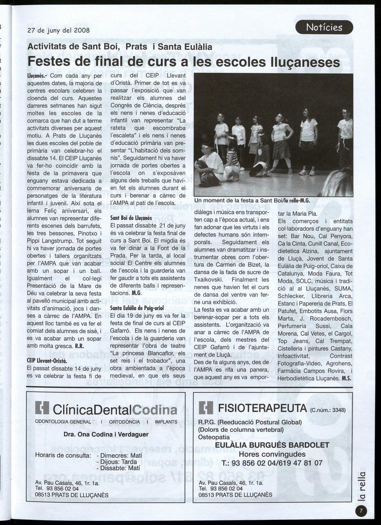 El passat dissabte 21 de juny és va celebrar la festa final de curs a Sant Boi. El migdia és va fer dinar a la Font de la Prada, Per la tarda, al local social El Centre els alumnes de l'escola i la guarderia van fer gaudir a tots els assistents de diferents balls i representacions. M.G.