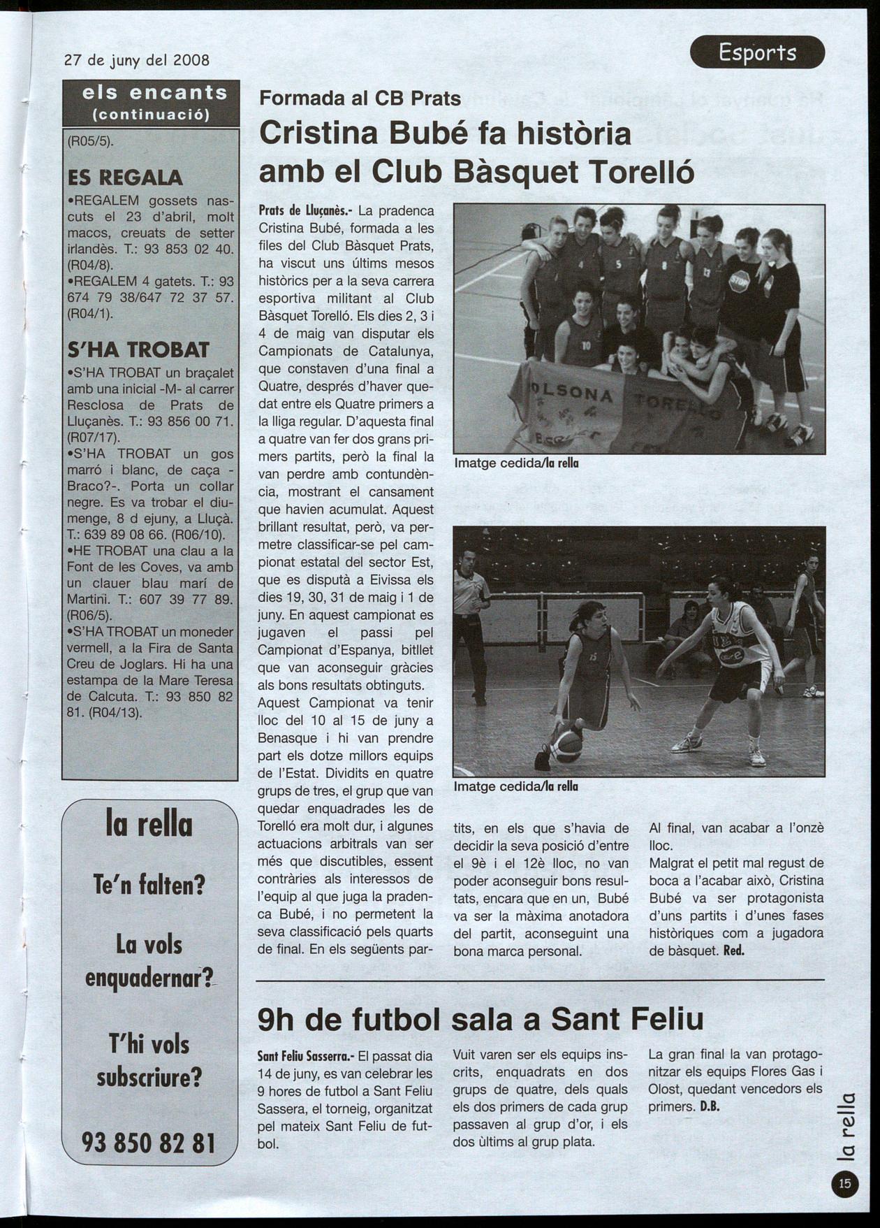 Prats de Lluçanès. - La pradenca Cristina Bubé, formada a les files del Club Bàsquet Prats, ha viscut uns últims mesos històrics per a la seva carrera esportiva militant al Club Bàsquet Torelló. Els dies 2, 3 i 4 de maig van disputar els Campionats de Catalunya, que constaven d'una final a Quatre, després d'haver quedat entre els Quatre primers a la lliga regular. D'aquesta final a quatre van fer dos grans primers partits, però la final la van perdre amb contundència, mostrant el cansament que havien acumulat. Aquest brillant resultat, però, va permetre classificar-se pel campionat estatal del sector Est, que es disputà a Eivissa els dies 19, 30, 31 de maig i 1 de juny. En aquest campionat es jugaven el passi pel Campionat d'Espanya, bitllet que van aconseguir gràcies als bons resultats obtinguts. Aquest Campionat va tenir lloc del 10 al 15 de juny a Benasque i hi van prendre part els dotze millors equips de l'Estat. Dividits en quatre grups de tres, el grup que van quedar enquadrades les de Torelló era molt dur, i algunes actuacions arbitrals van ser més que discutibles, essent contràries als interessos de l'equip al que juga la pradenca Bubé, no permetent la seva classificació pels quarts de final. En els següents par-