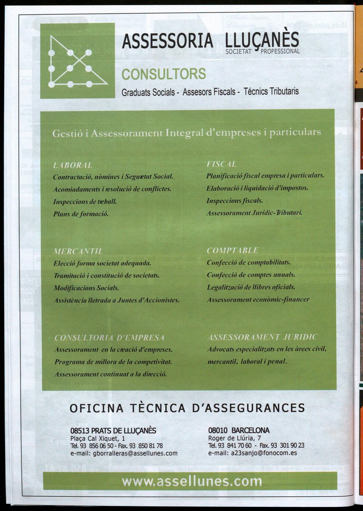 Plaça Cal Xiquet, 1 Tel. 93 856 06 50 - Fax. 93 8SO 81 78 e-mail: gborralleras@assellunes.com