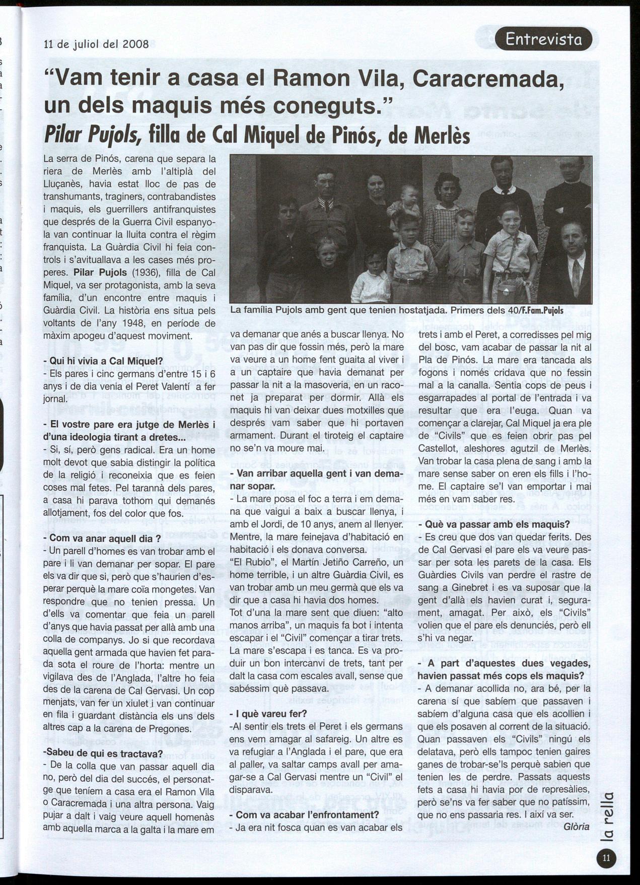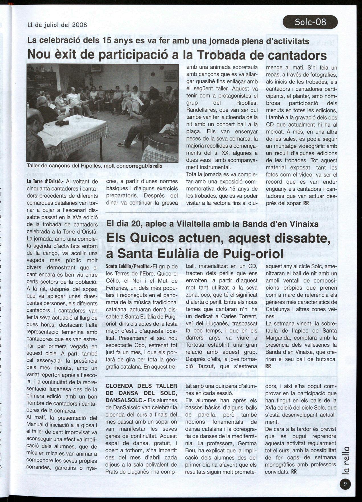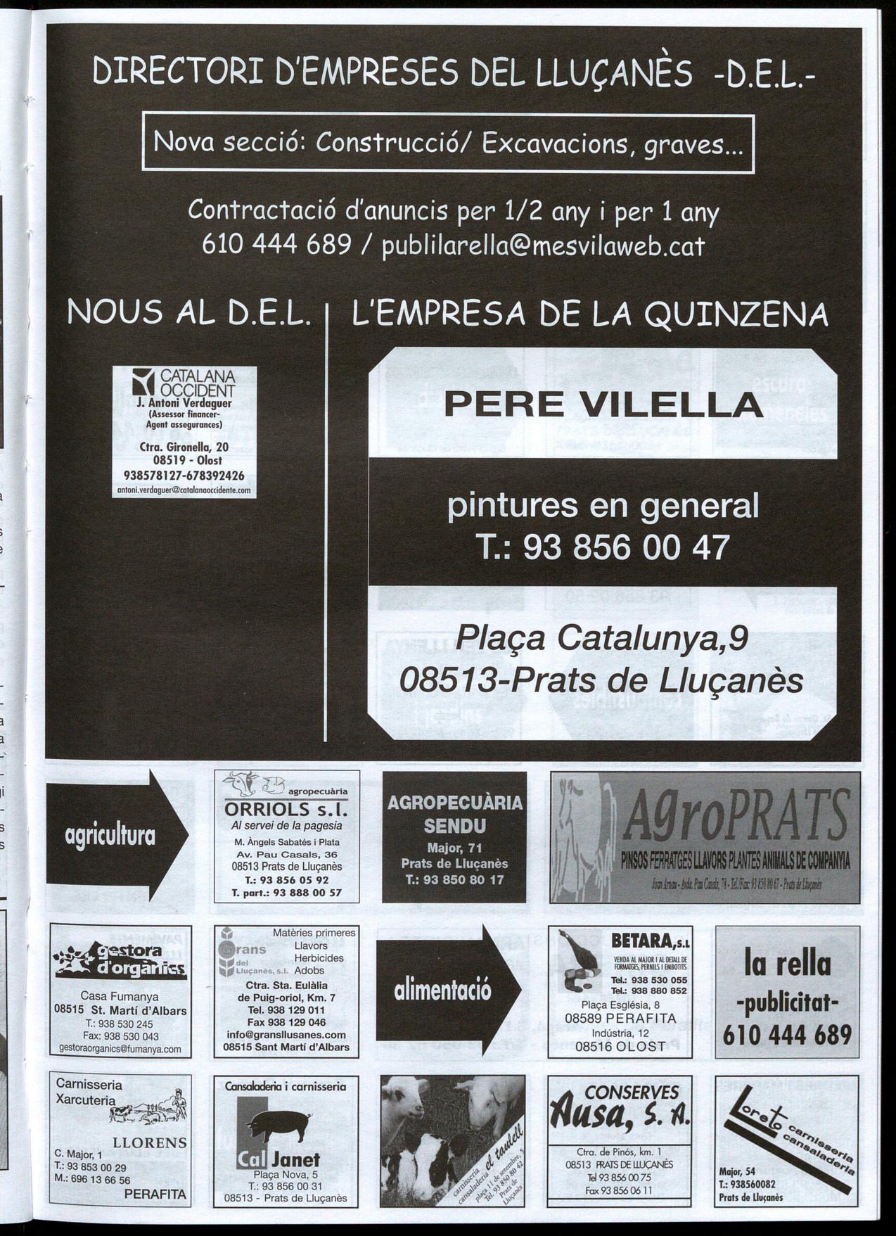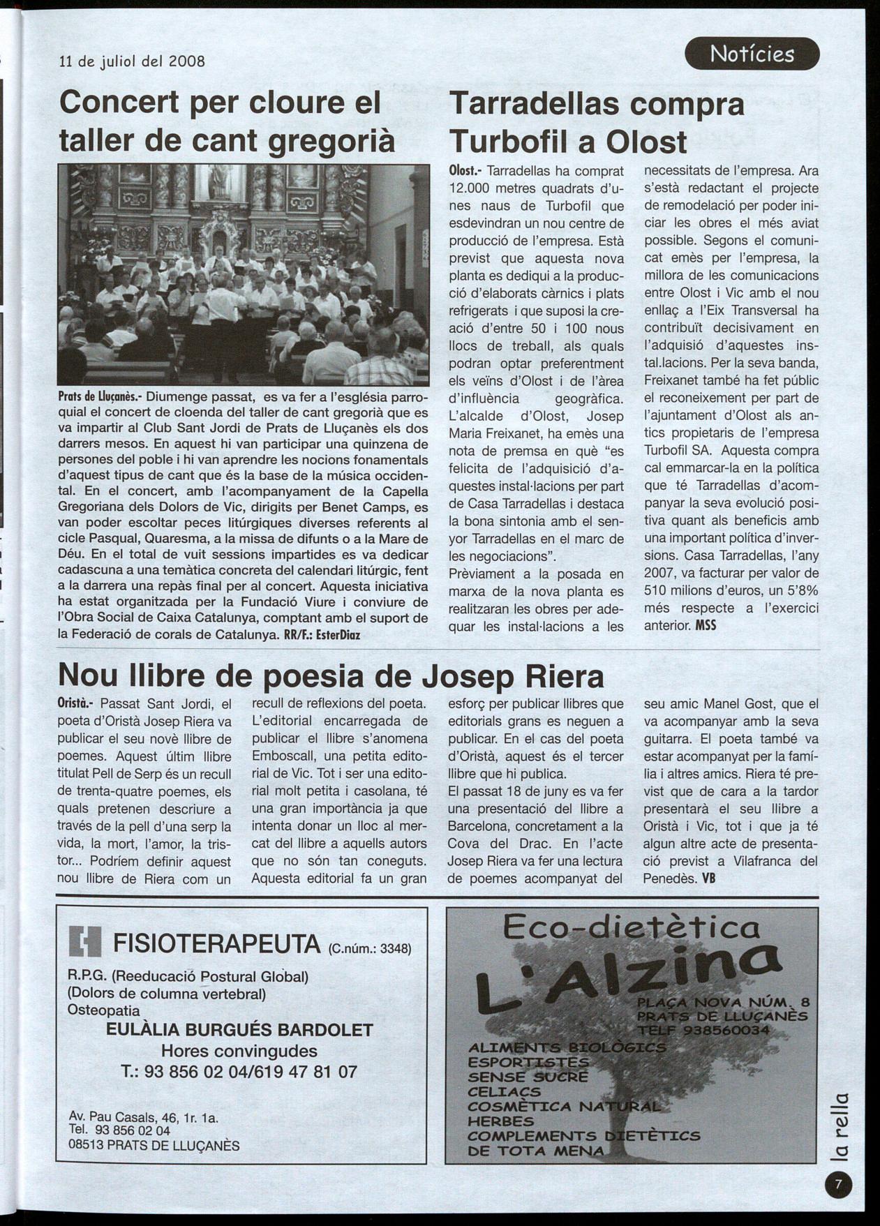 necessitats de l'empresa. Ara s'està redactant el projecte de remodelació per poder iniciar les obres el més aviat possible. Segons el comunicat emès per l'empresa, la millora de les comunicacions entre Olost Vic amb el nou enllaç a l'Eix Transversal ha contribuït decisivament en I'adquisió d'aquestes instal.lacions. Per la seva banda, Freixanet també ha fet públic el reconeixement per part de l'ajuntament d'Olost als antics propietaris de l'empresa Turbofil SA. Aquesta compra cal emmarcar-la en la política que té Tarradellas d'acompanyar la seva evolució positiva quant als beneficis amb una important política d'inversions. Casa Tarradellas, l'any 2007, va facturar per valor de 510 milions d'euros, un 5'8% més respecte a l'exercici anterior. MSS seu amic Manel Gost, que el va acompanyar amb la seva guitarra. El poeta també va estar acompanyat per la família altres amics. Riera té previst que de cara a la tardor presentarà el seu llibre a Oristà Vic, tot i que ja té algun altre acte de presentació previst a Vilafranca del Penedès. VB