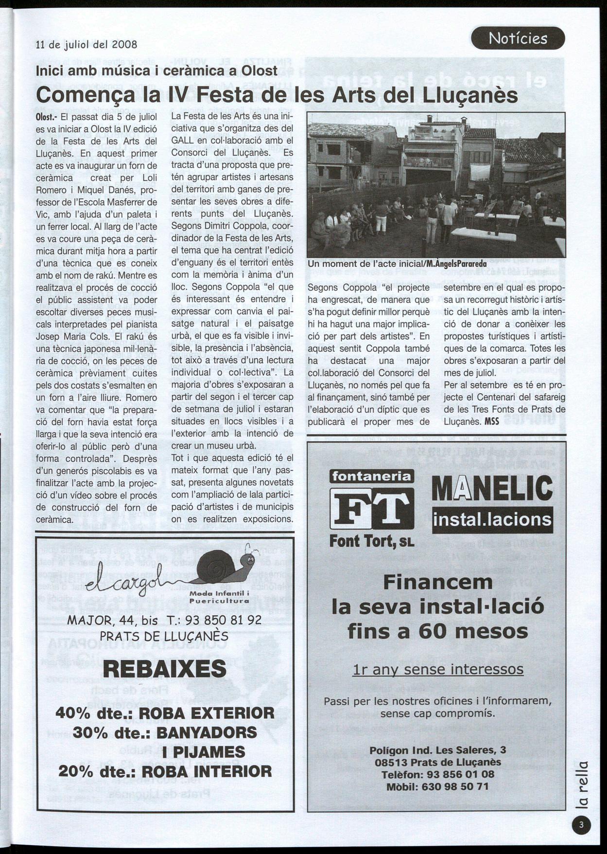 Olost.· El passat dia 5 de juliol es va iniciar a Olost la IV edició de la Festa de les Arts del Lluçanès. En aquest primer acte es va inaugurar un forn de cerarruca creat per Loli Romero Miquel Danés, professor de l'Escola Masferrer de Vic, amb l'ajuda d'un paleta un ferrer local. Aillarg de l'acte es va coure una peça de ceràmica durant mitja hora a partir d'una tècnica que es coneix amb el nom de rakú. Mentre es realitzava el procés de cocció el públic assistent va poder escoltar diverses peces musicals interpretades pel pianista Josep Maria Cols. El rakú és una tècnica japonesa mil·lenària de cocció, on les peces de ceràmica prèviament cuites pels dos costats s'esmalten en un forn a l'aire lliure. Romero va comentar que "la preparació del forn havia estat força llarga i que la seva intenció era oferir-lo al públic però d'una forma controlada". Desprès d'un generós piscolabis es va finalitzar l'acte amb la projecció d'un vídeo sobre el procés de construcció del forn de ceràmica.