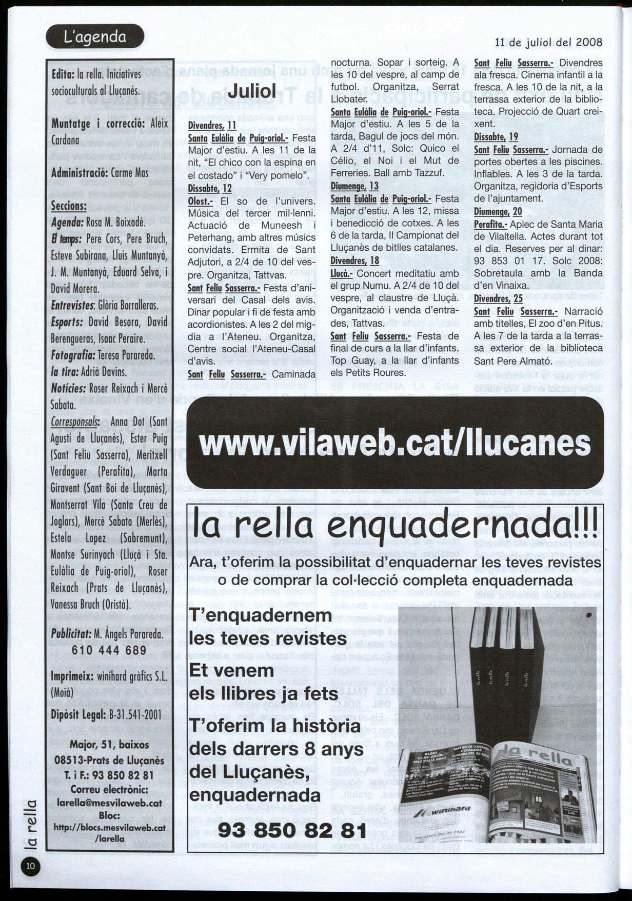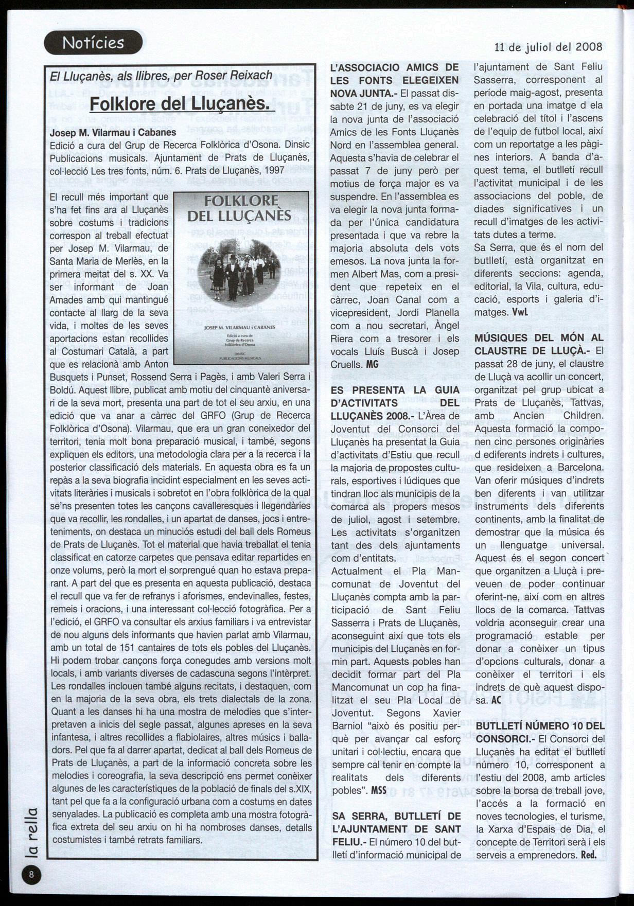 ES PRESENTA LA GUIA D'ACTIVITATS DEL LLUÇANÈS 2008.- L'Àrea de Joventut del Consorci del Lluçanès ha presentat la Guia d'activitats d'Estiu que recull la majoria de propostes culturals, esportives lúdiques que tindran lloc als municipis de la comarca als propers mesos de juliol, agost i setembre. Les activitats s'organitzen tant des dels ajuntaments com d'entitats. Actualment el Pla Mancomunat de Joventut del Lluçanès compta amb la participació de Sant Feliu Sasserra i Prats de Lluçanès, aconseguint així que tots els municipis del Lluçanès en formin part. Aquests pobles han decidit formar part del Pla Mancomunat un cop ha finalitzat el seu Pla Local de Joventut. Segons Xavier Barniol "això és positiu perquè per avançar cal esforç unitari col·lectiu, encara que sempre cal tenir en compte la realitats dels diferents pobles". MSS