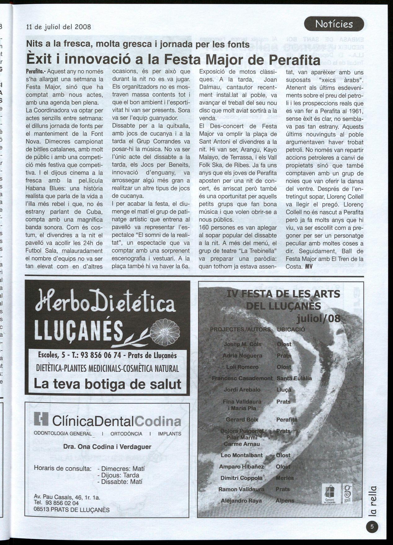 Perafita.- Aquest any no només s'ha allargat una setmana la Festa Major, sinó que ha comptat amb nous actes, amb una agenda ben plena. La Coordinadora va optar per actes senzills entre setmana: el dilluns jornada de fonts per el manteniment de la Font Nova. Dimecres campionat de bitlles catalanes, amb molt de públic amb una competició més festiva que competitiva. el dijous cinema a la fresca amb la pel.lícula Habana Blues: una història realista que parla de la vida a l'illa més rebel i que, no és estrany parlant de Cuba, compta amb una magnífica banda sonora. Com és costum, el divendres a la nit el pavelló va acollir les 24h de Futbol Sala, malauradament el nombre d'equips no va ser tan elevat com en d'altres