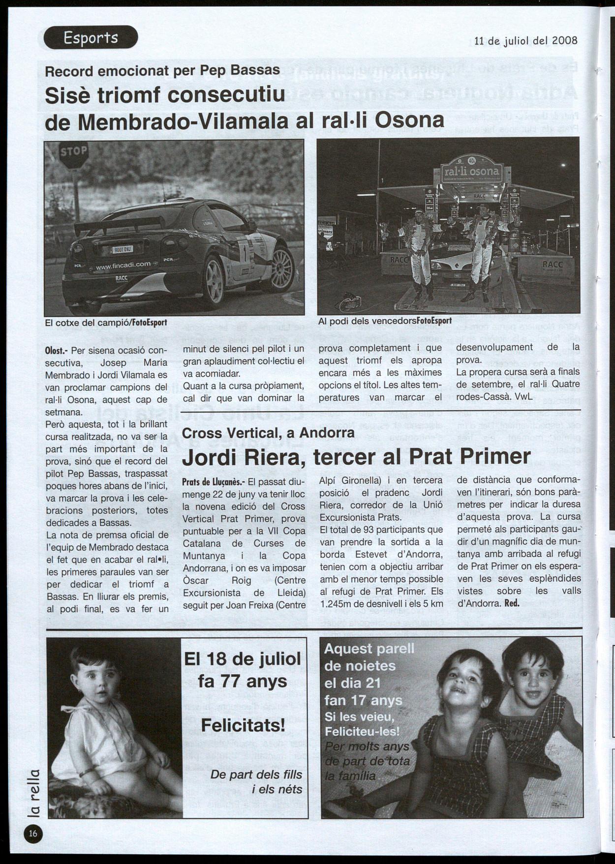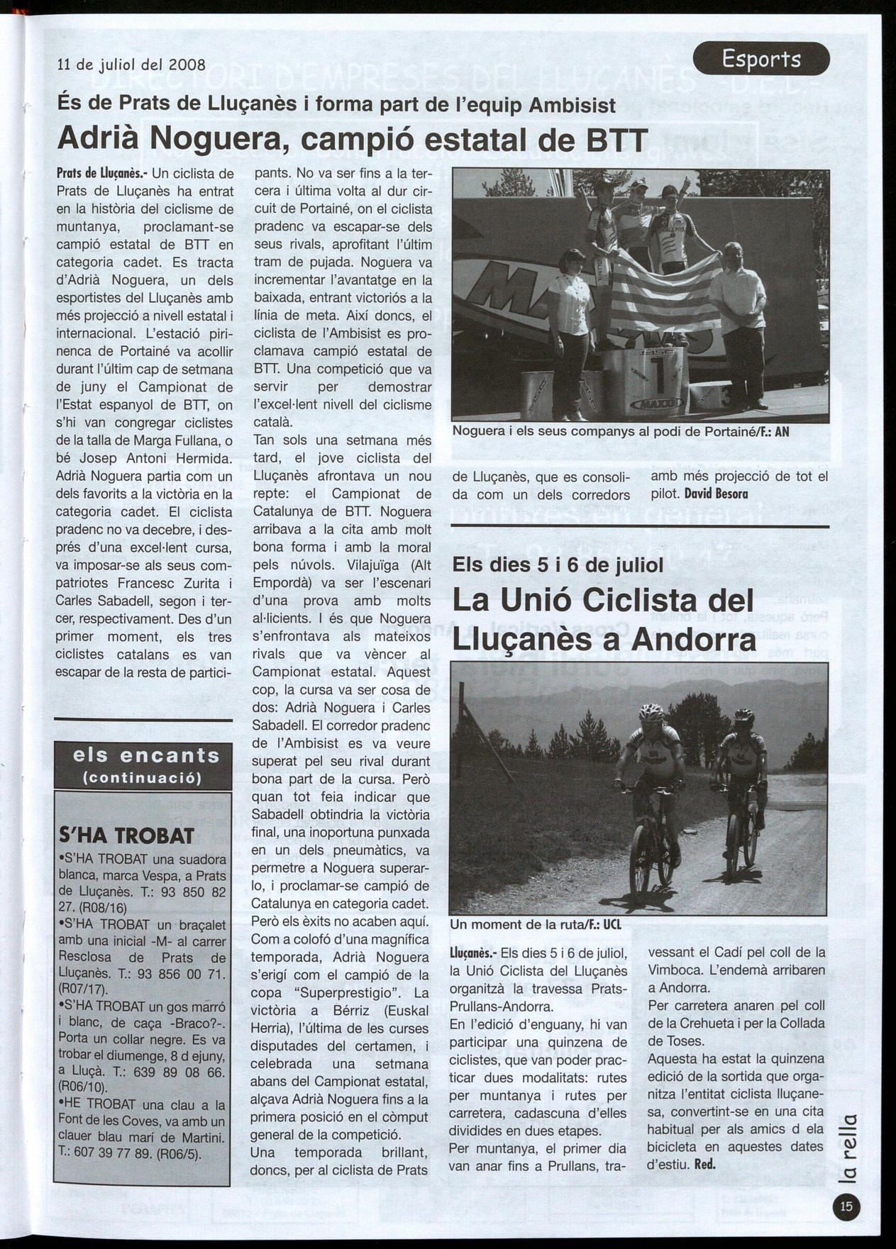 Prats de L1uçanès.- Un ciclista de Prats de Lluçanès ha entrat en la història del ciclisme de muntanya, proclamant-se campió estatal de BFf en categoria cadet. Es tracta d'Adrià Noguera, un dels esportistes del Lluçanès amb més projecció a nivell estatal internacional. L'estació pirinenca de Portainé va acollir durant l'últim cap de setmana de juny el Campionat de l'Estat espanyol de Bn, on s'hi van congregar ciclistes de la talla de Marga Fullana, a bé Josep Antoni Hermida. Adrià Noguera partia com un dels favorits a la victòria en la categoria cadet. El ciclista pradenc no va decebre, i després d'una excel·lent cursa, va imposar-se als seus compatriotes Francesc Zurita Carles Sabadell, segon i tercer, respectivament. Des d'un primer moment, els tres ciclistes catalans es van escapar de la resta de partiel-
