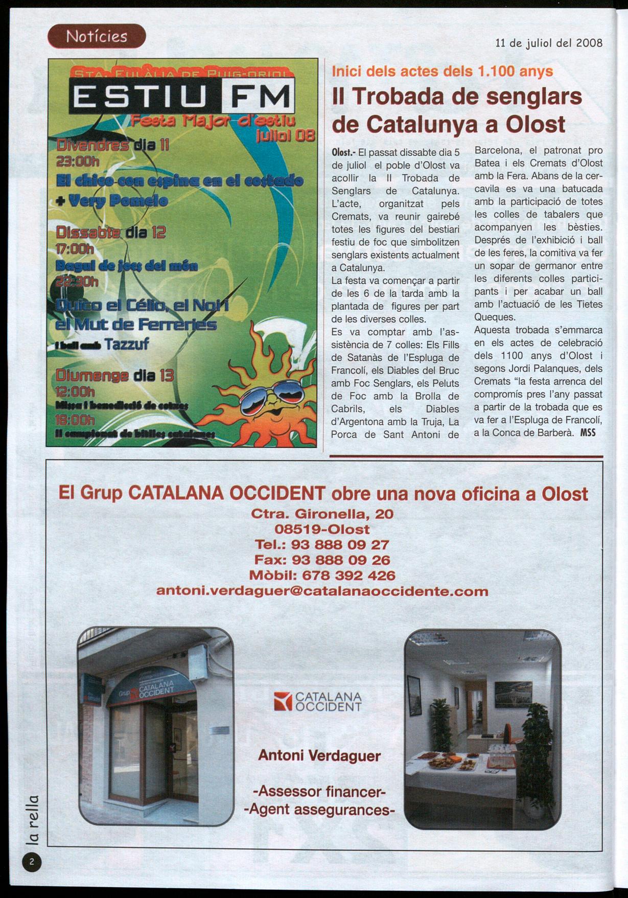 Olost.- El passat dissabte dia 5 de juliol el poble d'Olost va acollir la II Trobada de Senglars de Catalunya. L'acte, organitzat pels Cremats, va reunir gairebé totes les figures del bestiari festiu de foc que simbolitzen senglars existents actualment a Catalunya.