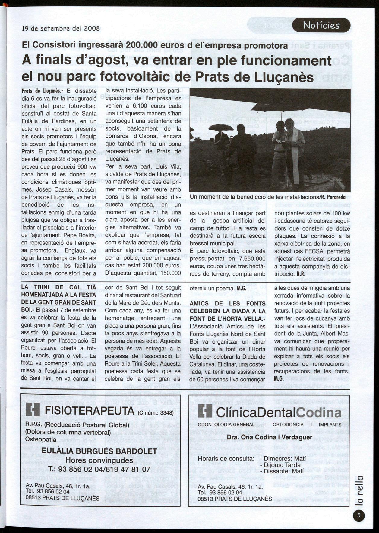 Prats de Lluçanès.- El dissabte dia 6 es va fer la inauguració oficial del parc fotovoltaic construït al costat de Santa Eulàlia. de Pardines, en un acte on hi van ser presents els socis promotors i l'equip de govern de l'ajuntament de Prats. El parc funciona però des del passat 28 d'agost es preveu que produeixi 900 kw cada hora si es donen les condicions climàtiques òptimes. Josep Casals, mossèn de Prats de Lluçanès, va fer la benedicció de les instal·lacions enmig d'una tarda plujosa que va obligar a traslladar el piscolabis a l'interior de l'ajuntament. Pepe Rovira, en representació de l'empresa promotora, Engiaux, va agrair la confiança de tots els socis també les facilitats donades pel consistori per a