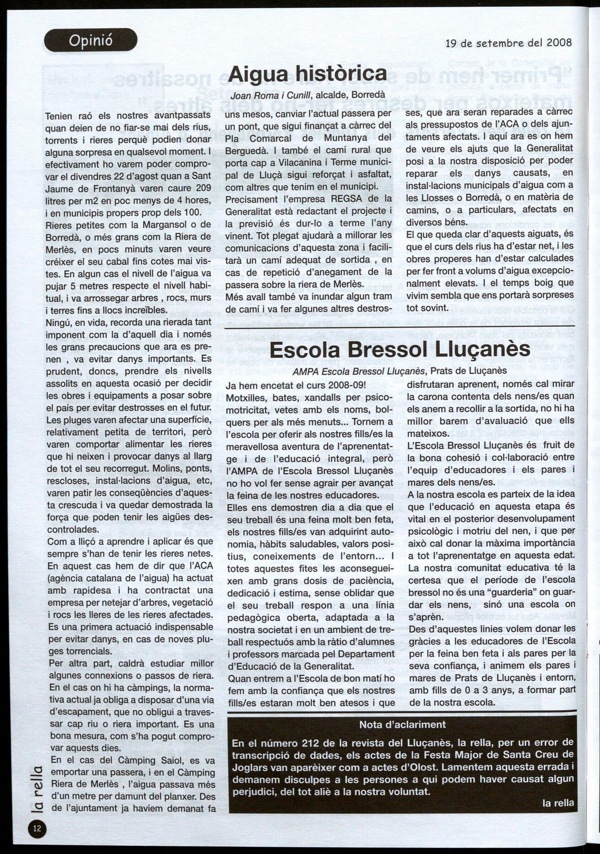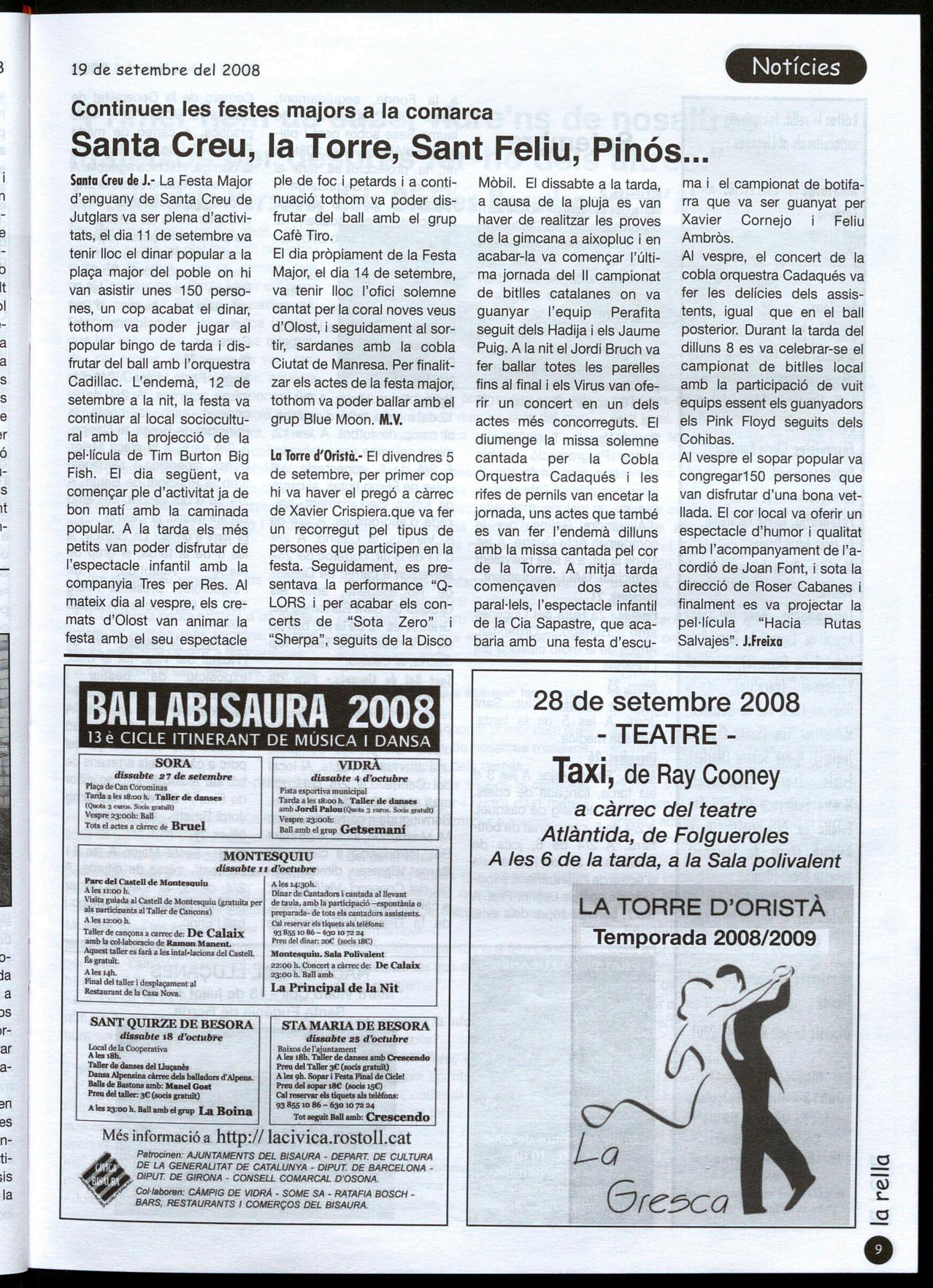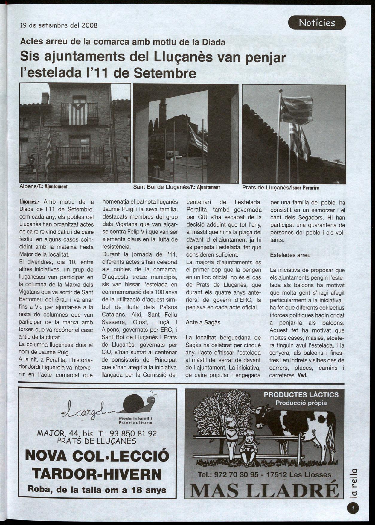 Llu�anès.· Amb motiu de la Diada de I'll de Setembre, com cada any, els pobles del Lluçanès han organitzat actes de caire reivindicatiu i de caire festiu, en alguns casos coincidint amb la mateixa Festa Major de la localitat.