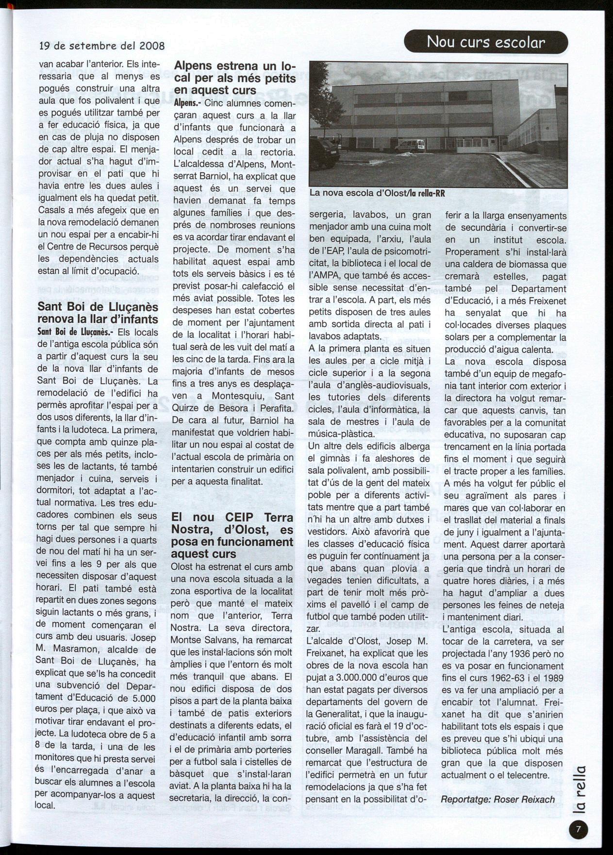 Lluçanès.- El nou curs escolar ha començat amb normalitat als centres del Lluçanès, observant-se un lleuger creixement d'alumnes que marca una nova tendència, ja que des de fa anys es notava cert descens general. Aquest augment d'alumnes ve donat sobretot a dues poblacions, Perafita i Sant Feliu Sasserra. En la primera, i continuant el gran creixement experimentat des del curs 2005-06, quan només tenia 13 alumnes, s'ha passat als 28 actuals, mentre que el curs anterior n'hi havia 23. Quant a Sant Feliu Sasserra, actualment compta amb 53 alumnes el curs anterior només en tenia 45. Aquestes dues escoles formen part de les dues ZER (Zones escolars rurals) existents a la comarca. Perafita pertany a la ZER Alt Lluçanès, on es mantenen en els altres centres unes xifres semblants al curs anterior. Alpens passa de 23 a 22 alumnes, Santa Eulàlia de Puig-oriol, de 17 a 18, Sant Boi de Lluçanès de 44 a 42. Pel que fa a la ZER Gavarresa, destaca també l'increment de l'escola d'Oristà que passa a tenir 18 alumnes mentre que el curs anterior només en tenia 14. Com altres ZER de Catalunya, a part del professorat del centre, compten amb mestres especialistes itinerants que en el cas de l'Ait Lluçanès són 5 de la Gavarresa 4.