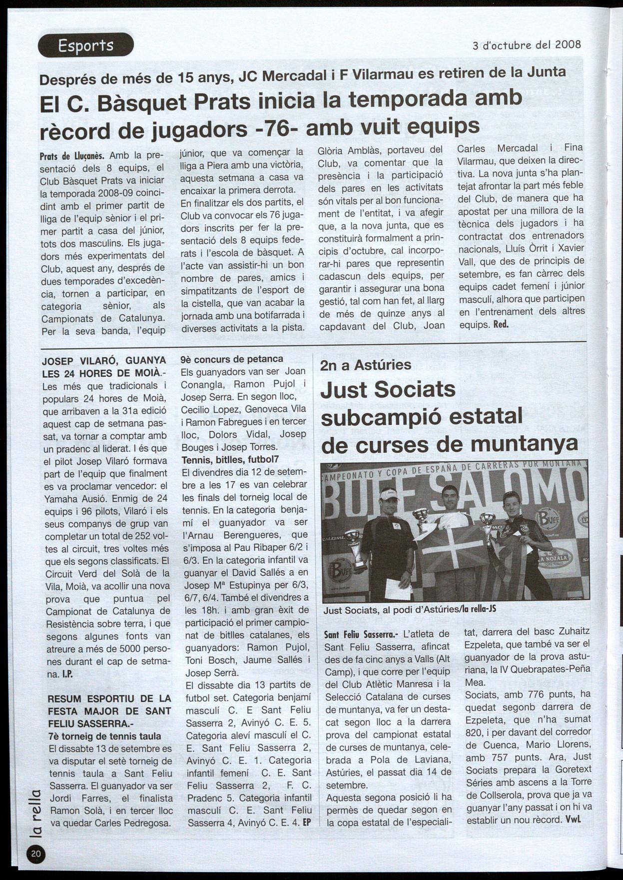 Sanf Feliu Sasserra.- L'atleta de Sant Feliu Sasserra, afincat des de fa cinc anys a Valls (Alt Camp), i que corre per l'equip del Club Atlètic Manresa i la Selecció Catalana de curses de muntanya, va fer un destacat segon lloc a la darrera prova del campionat estatal de curses de muntanya, celebrada a Pola de Laviana, Astúries, el passat dia 14 de setembre.