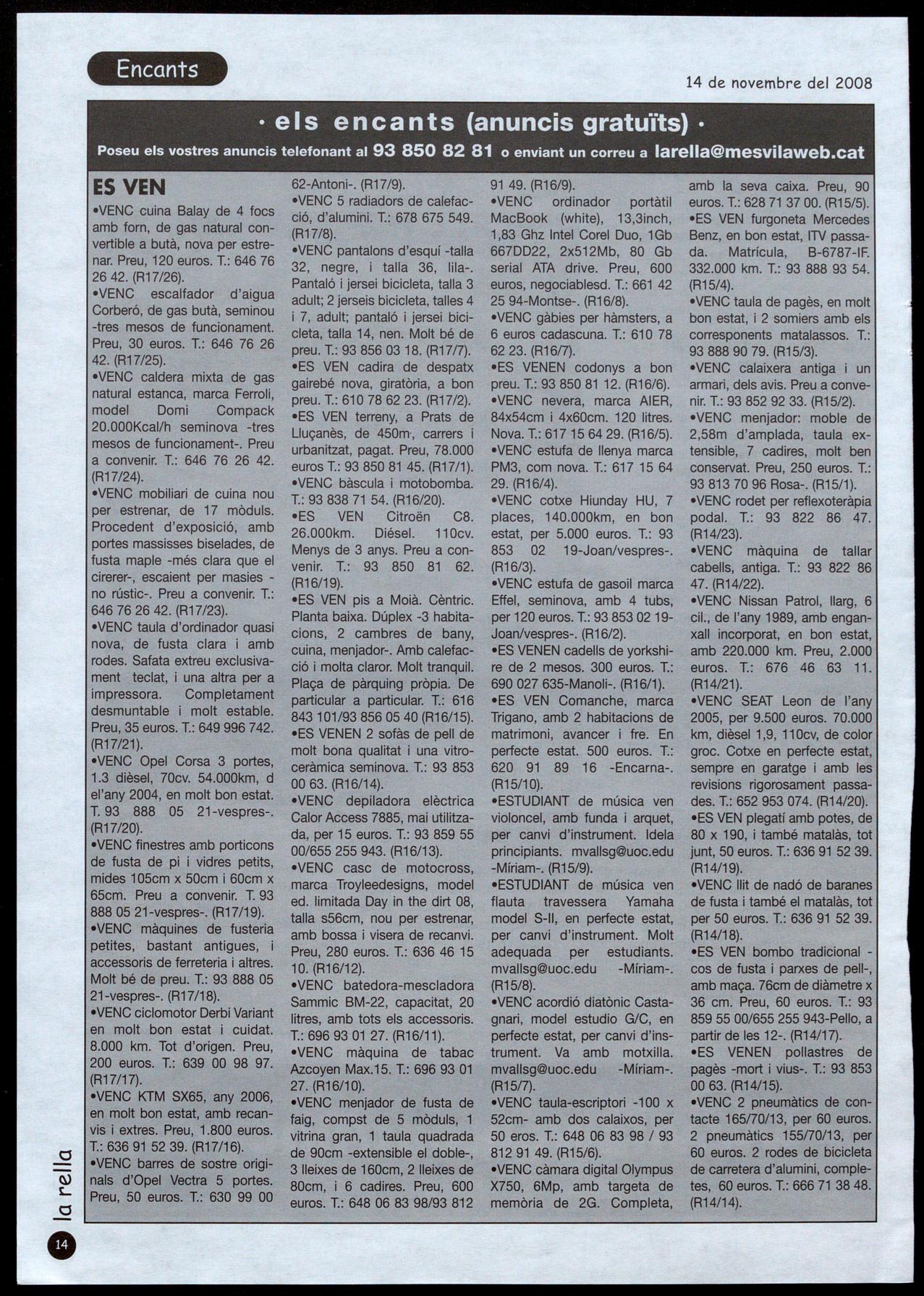 amb la seva caixa. Preu, 90 euros. T.: 628 71 37 OO. (R15/5). ·ES VEN furgoneta Mercedes Benz, en bon estat, ITV passada. Matrícula, B-6787-IF. 332.000 km. T.: 93 888 93 54. (R15/4).