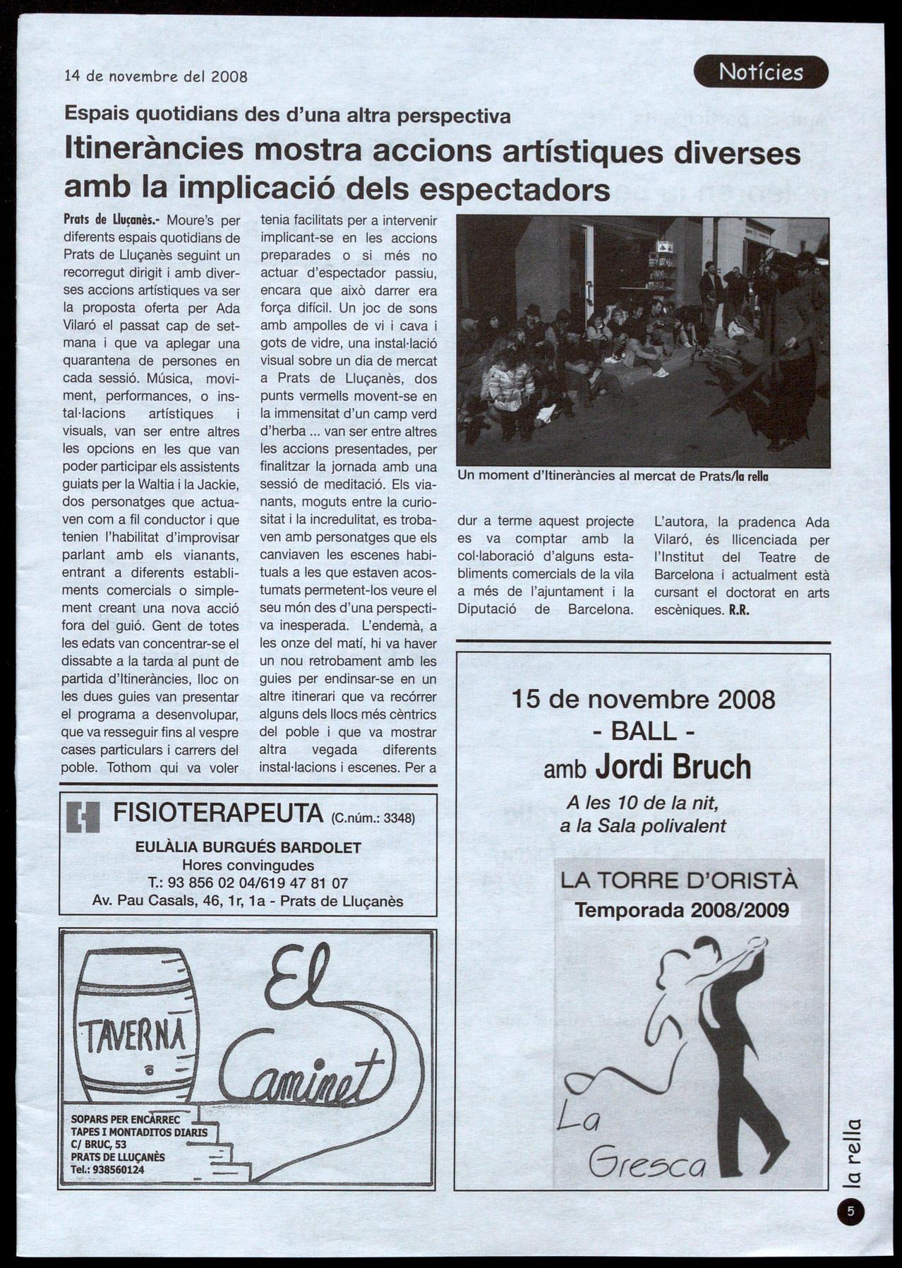 Prats de Lluçanès.- Moure's per diferents espais quotidians de Prats de Lluçanès seguint un recorregut dirigit amb diverses accions artístiques va ser la proposta oferta per Ada Vilaró el passat cap de setmana i que va aplegar una quarantena de persones en cada sessió. Música, moviment, performances, a instal·lacions artístiques visuals, van ser entre altres les opcions en les que van poder participar els assistents guiats per la Waltia la Jackie, dos personatges que actuaven com a fil conductor que tenien l'habilitat d'improvisar parlant amb els vianants, entrant a diferents establiments comercials a simplement creant una nova acció fora del guió. Gent de totes les edats van concentrar-se el dissabte a la tarda al punt de partida d'itineràncies, lloc on les dues guies van presentar el programa a desenvolupar, que va resseguir fins al vespre cases particulars carrers del poble. Tothom qui va voler