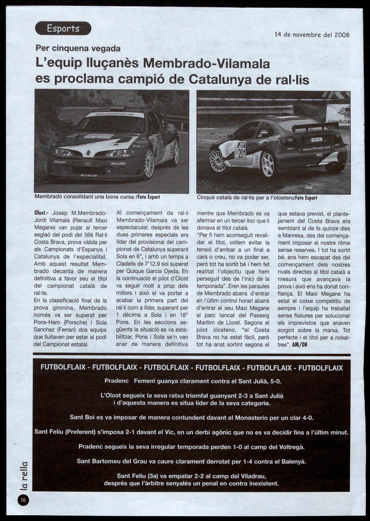 Olost.- Josep M.MembradoJordi Vilamala (Renault Maxi Megane) van pujar al tercer esglaó del podi del 56è Ral·li Costa Brava, prova vàlida per als Campionats d'Espanya Catalunya de l'especialitat. Amb aquest resultat Membrado decanta de manera definitiva a favor seu el títol del campionat català de ral·lis.