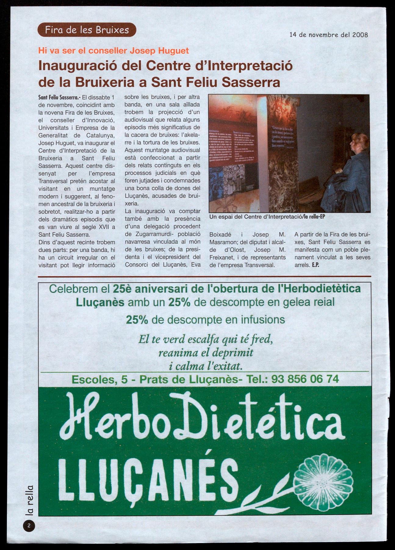 Sant Feliu Sasserra." El dissabte 1 de novembre, coincidint amb la novena Fira de les Bruixes, el conseller d'Innovació, Universitats i Empresa de la Generalitat de Catalunya, Josep Huguet, va inaugurar el Centre d'Interpretació de la Bruixeria a Sant Feliu Sasserra. Aquest centre dissenyat per l'empresa Transversal pretén acostar al visitant en un muntatge modern suggerent, al fenomen ancestral de la bruixeria i sobretot, realitzar-ho a partir dels dramàtics episodis que es van viure al segle XVII a Sant Feliu Sasserra. Dins d'aquest recinte trobem dues parts: per una banda, hi ha un circuit irregular on el visitant pot llegir informació