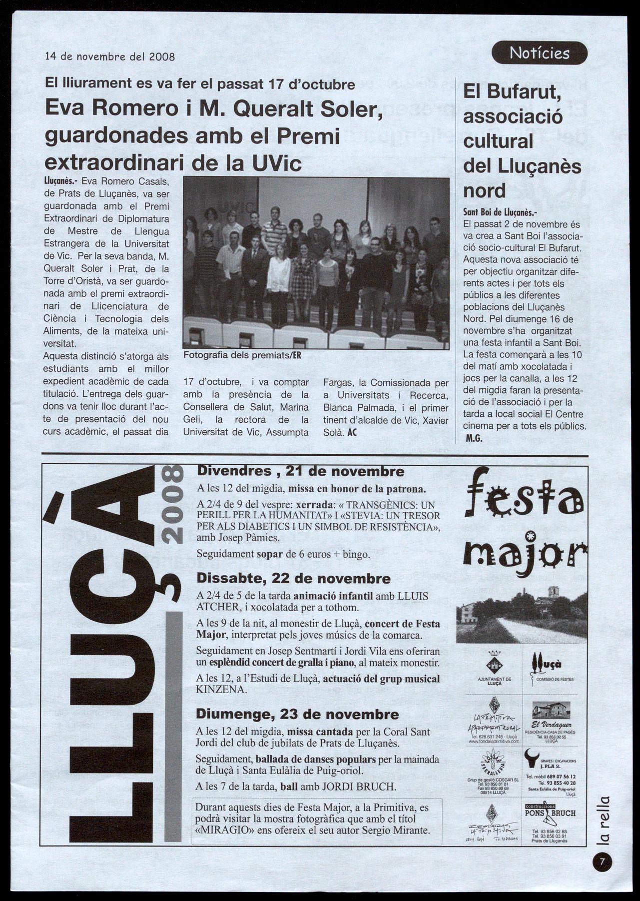 Sant Boi de Lluçanès.El passat 2 de novembre és va crea a Sant Boi l'associació socio-cultural El Bufarut. Aquesta nova associació té per objectiu organitzar diferents actes i per tots els públics a les diferentes poblacions del Lluçanès Nord. Pel diumenge 16 de novembre s'ha organitzat una festa infantil a Sant Boi. La festa començarà a les 1 O del matí amb xocolatada i jocs per la canalla, a les 12 del migdia faran la presentació de l'associació per la tarda a local social El Centre cinema per a tots els públics. M.G.