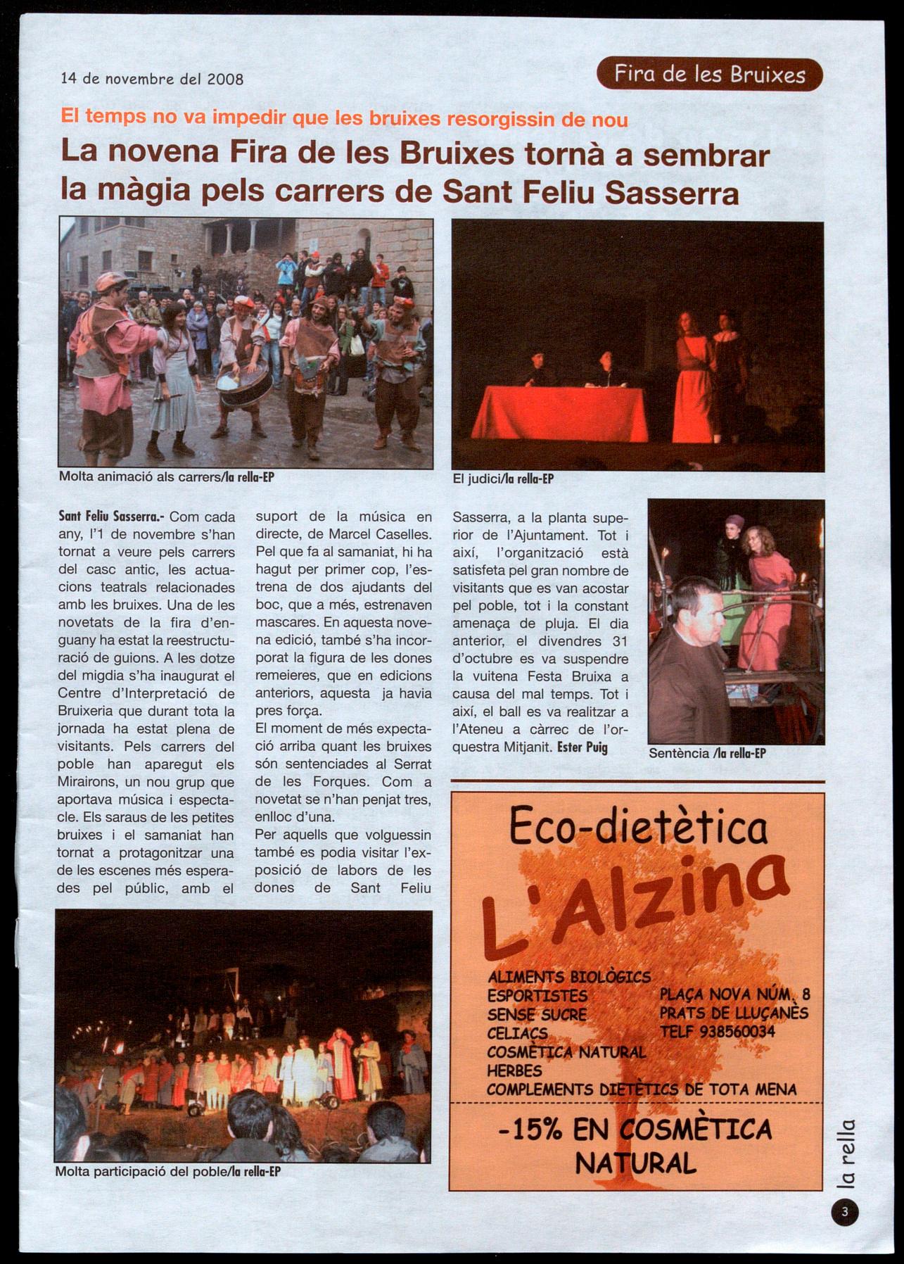 Sant Feliu Sasserra.- Com cada any, 1'1 de novembre s'han tornat a veure pels carrers del casc antic, les actuacions teatrals relacionades amb les bruixes. Una de les novetats de la fira d'enguany ha estat la reestructuració de guions. A les dotze del migdia s'ha inaugurat el Centre d'Interpretació de Bruixeria que durant tota la jornada ha estat plena de visitants. Pels carrers del poble han aparegut els Mirairons, un nou grup que aportava música espectacle. Els saraus de les petites bruixes i el samaniat han tornat a protagonitzar una de les escenes més esperades pel públic, amb el