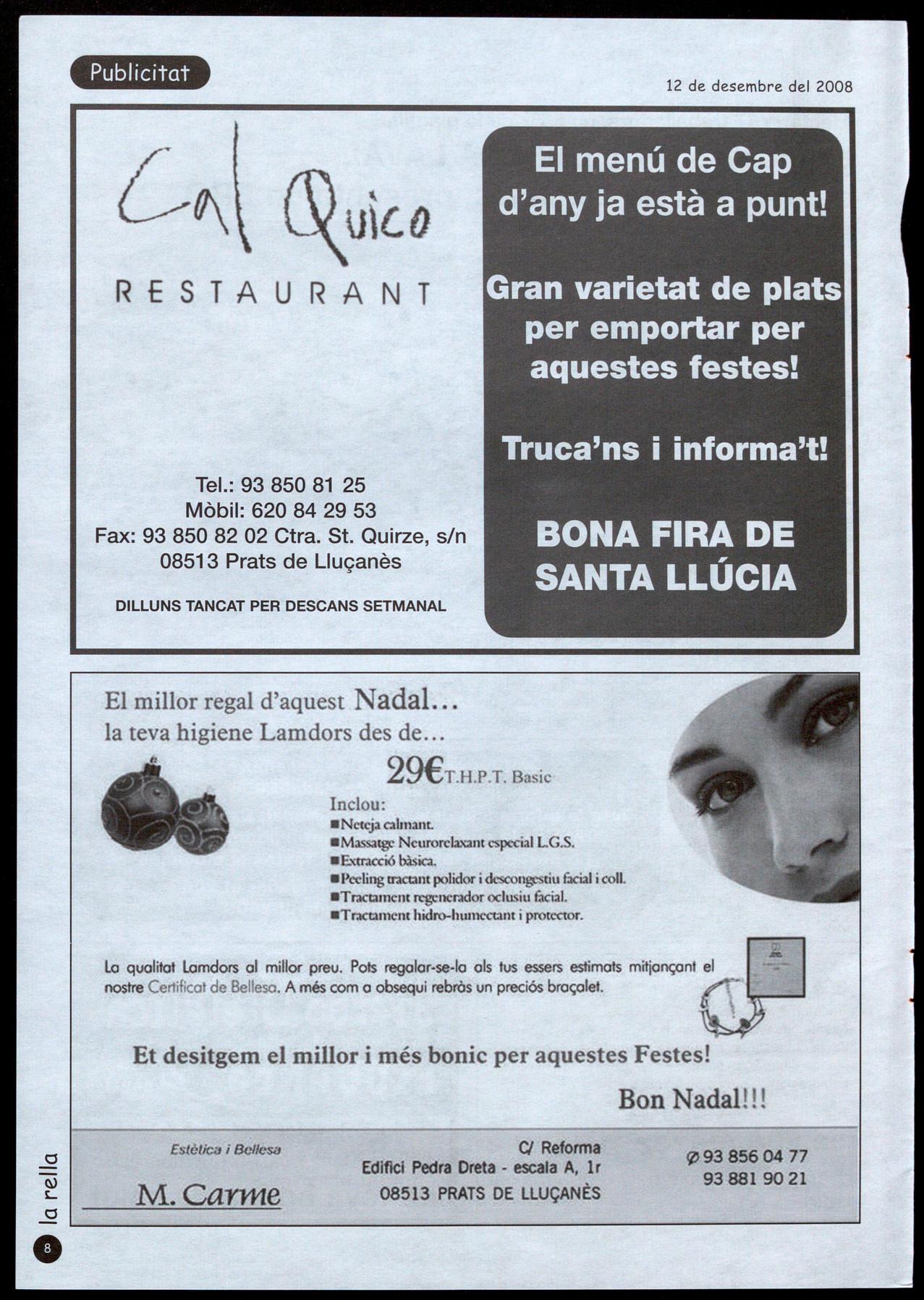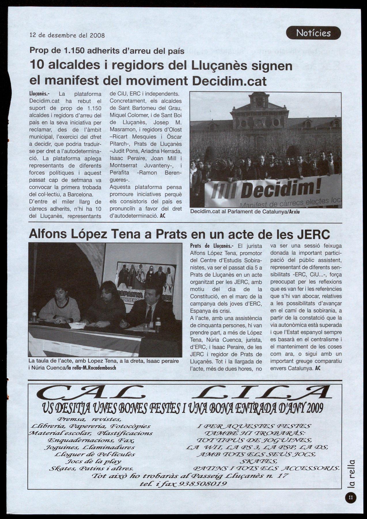El grup municipal d'ERC de Prats de Lluçanès ha repartit un nou exemplar del seu butlletí informatiu, cERCavila. En aquesta ocasió, el full, amb data de desembre i corresponent al número 35, parla de la crisi de l'oposició del grup d'ERC a l'ajuntament pradenc a l'aprovació de les ordenances fiscals presentades per l'equip de govern en el darrer ple. La seva oposició es fonamenta en el fet que la situació de crisi, diuen, hauria d'aconsellar una congelació de les taxes per a l'exercici 2009, sobretot tenint en compte que l'equip de CiU ha reconegut que l'ajuntament té superàvit. El grup opositor remarca que el pressupost de què parla CiU el va elaborar ERC quan encara governava. Per la seva banda, CiU ha repartit el seu Parlem-ne número 28, dedicat a felicitar les festes, plantejar un joc sobre la molta feina que fa l'equip de govern de CiU a l'ajuntament i per criticar l'oposició d'ERC en el tema que més fa córrer tinta entre ambdós grups: si el superàvit municipal és gràcies als uns o als altres si els uns o els altres són capaços dse gestionar bé els diners. Aquest tema es tracta en un text anomenat "el desembre Fum!!!". AC vint-i-cinc de Fum, Fum,