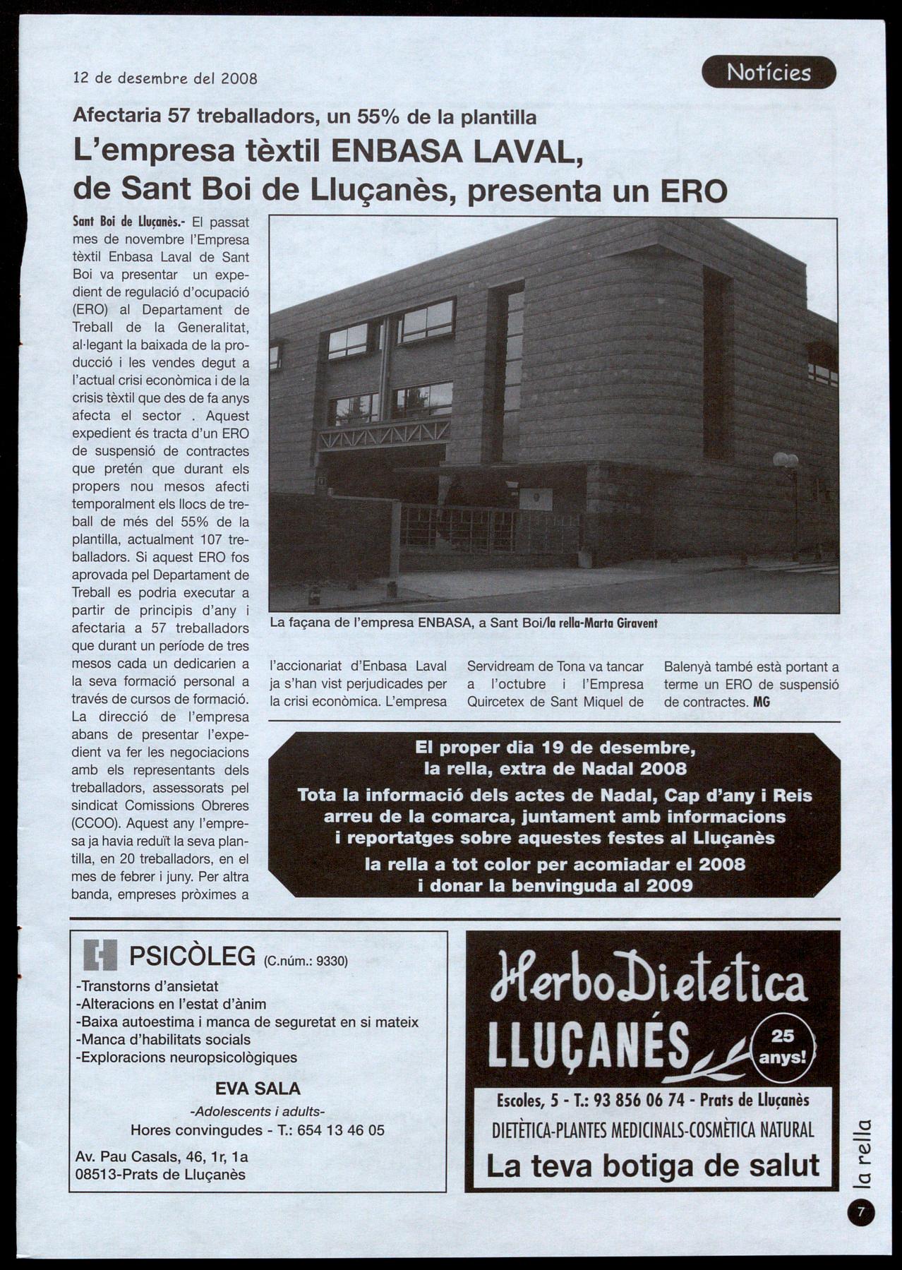 Sant Boi de Lluçanès. - El passat mes de novembre l'Empresa tèxtil Enbasa Laval de Sant Boi va presentar un expedient de regulació d'ocupació (ERO) al Departament de Treball de la Generalitat, al-Ieqant la baixada de la producció les vendes degut a l'actual crisi econòmica de la crisis tèxtil que des de fa anys afecta el sector Aquest expedient és tracta d'un ERO de suspensió de contractes que pretén que durant els propers nou mesos afecti temporalment els llocs de treball de més del 55% de la plantilla, actualment 107 treballadors. Si aquest ERO fos aprovada pel Departament de Treball es podria executar a partir de principis d'any afectaria a 57 treballadors que durant un període de tres mesos cada un dedicarien a la seva formació personal a través de cursos de formació. La direcció de l'empresa abans de presentar l'expedient va fer les negociacions amb els representants dels treballadors, assessorats pel sindicat Comissions Obreres (CCOO). Aquest any l'empresa ja havia reduït la seva plantilla, en 20 treballadors, en el mes de febrer i juny. Per altra banda, empreses pròximes a