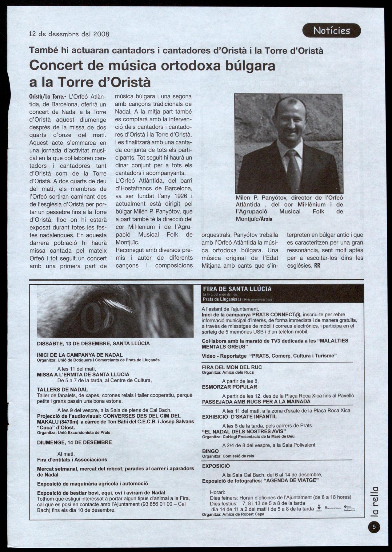 Oristà/La Torre.- L'Orfeó Atlàntida, de Barcelona, oferirà un concert de Nadal a la Torre d'Oristà aquest diumenge després de la missa de dos quarts d'onze del mati.