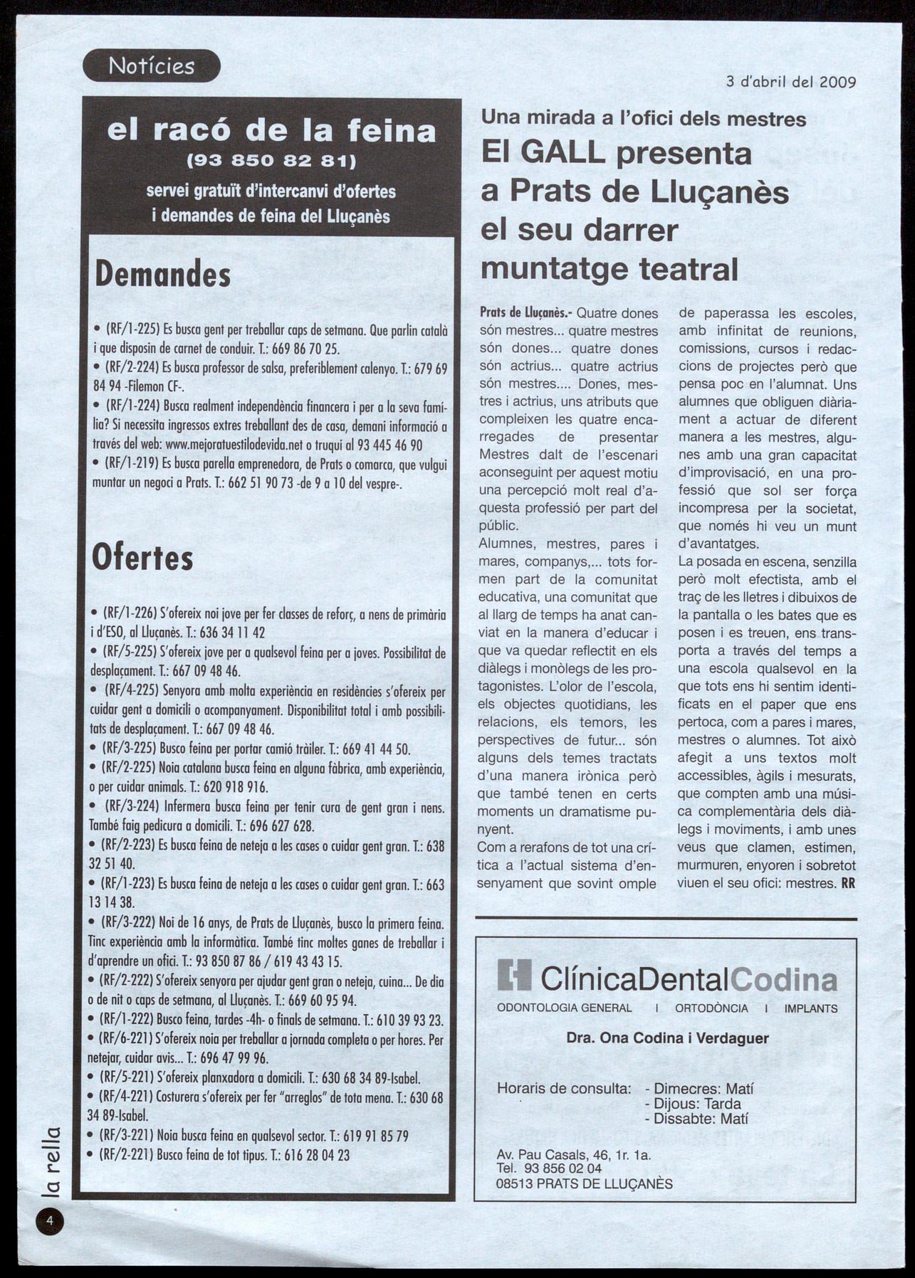 (RF/3-2221 Noi de 16 anys, de Prats de lluçanès, busco la primera feina. TIne experiència amb la informàtica. També tinc moltes ganes de treballar i d'aprendre un ofici. 1: 93 850 87 86 / 619 43 43 15.