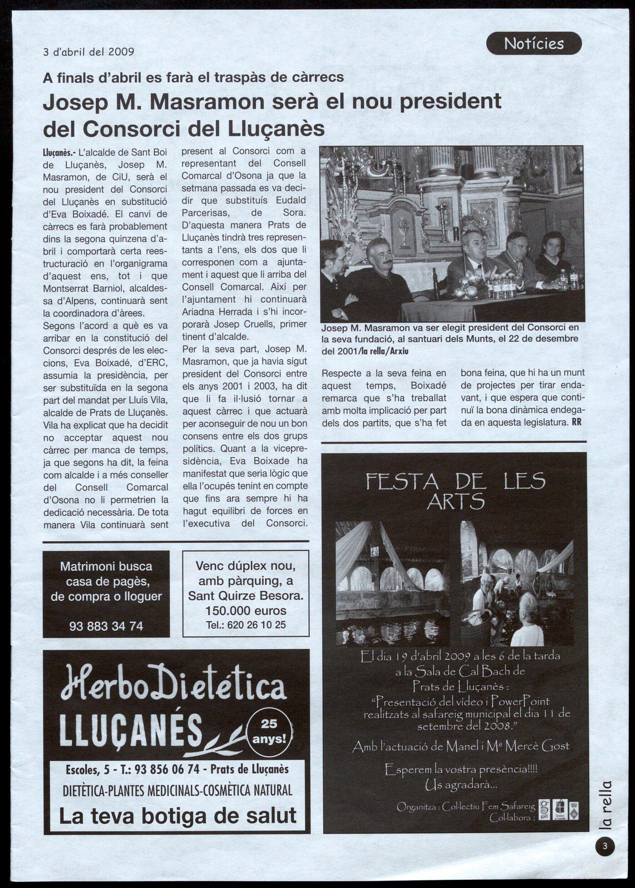 L1uçanès.- L'alcalde de Sant Boi de Lluçanès, Josep M. Masramon, de CiU, serà el nou president del Consorci del Lluçanès en substitució d'Eva Boixadé. El canvi de càrrecs es farà probablement dins la segona quinzena d'abril comportarà certa reestructuració en l'organigrama d'aquest ens, tot que Montserrat Barniol, alcaldessa d'Alpens, continuarà sent la coordinadora d'àrees.
