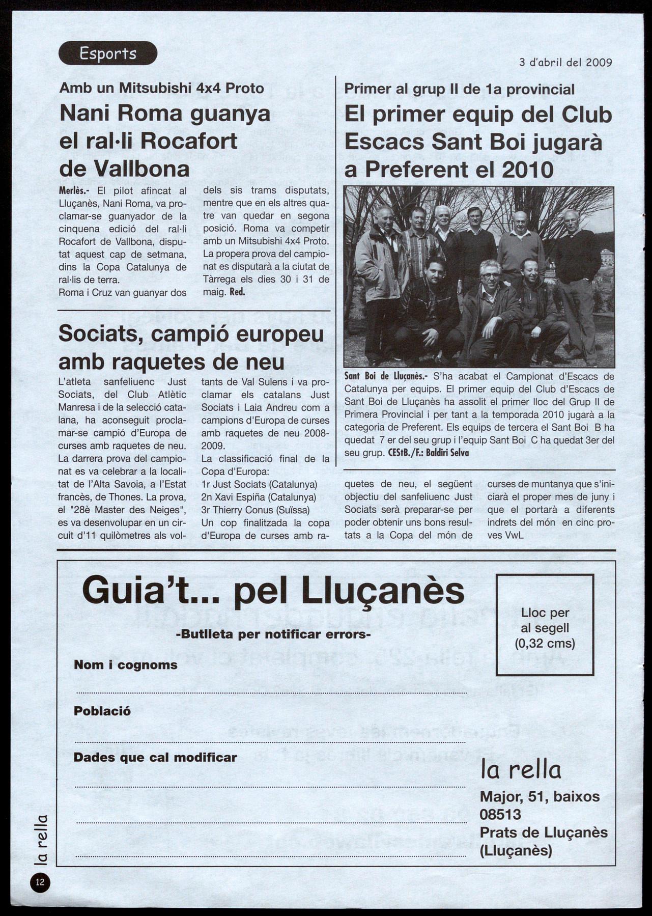 Boi de Lluçanès.- S'ha acabat el Campionat d'Escacs de Catalunya per equips. El primer equip del Club d'Escacs de Sant Boi de Lluçanès ha assolit el primer lloc del Grup " de Primera Provincial i per tant a la temporada 2010 jugarà a la categoria de Preferent. Els equips de tercera el Sant Boi B ha quedat 7 er del seu grup l'equip Sant Boi C ha quedat 3er del seu grup. CEStB.fF.: Baldiri Selva