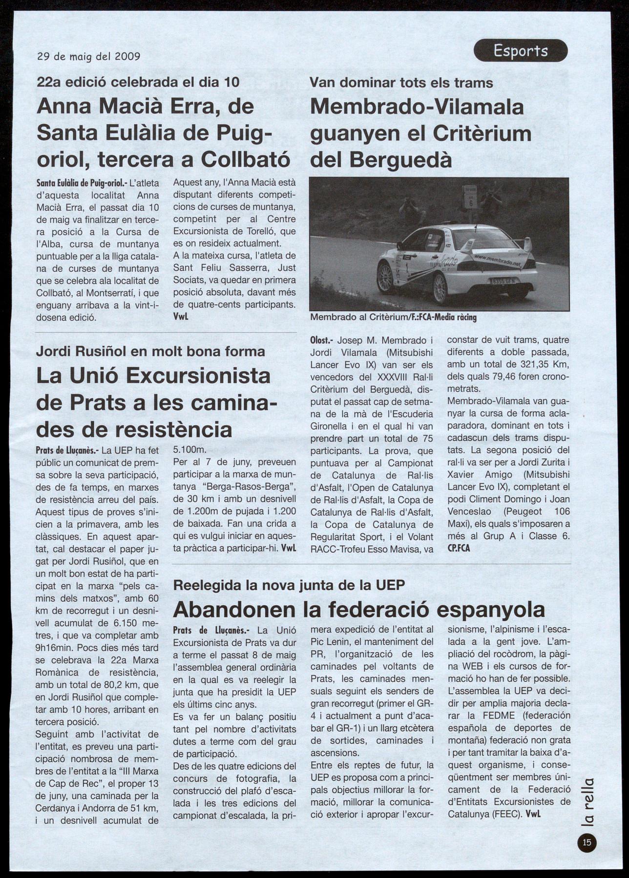 Prats de Lluçanès.- La Unió Excursionista de Prats va dur a terme el passat 8 de maig l'assemblea general ordinària en la qual es va reelegir la junta que ha presidit la UEP els últims cinc anys. Es va fer un balanç positiu tant pel nombre d'activitats dutes a terme com del grau de participació. Des de les quatre edicions del concurs de fotografia, la construcció del plafó d'escalada i les tres edicions del campionat d'escalada, la pri-