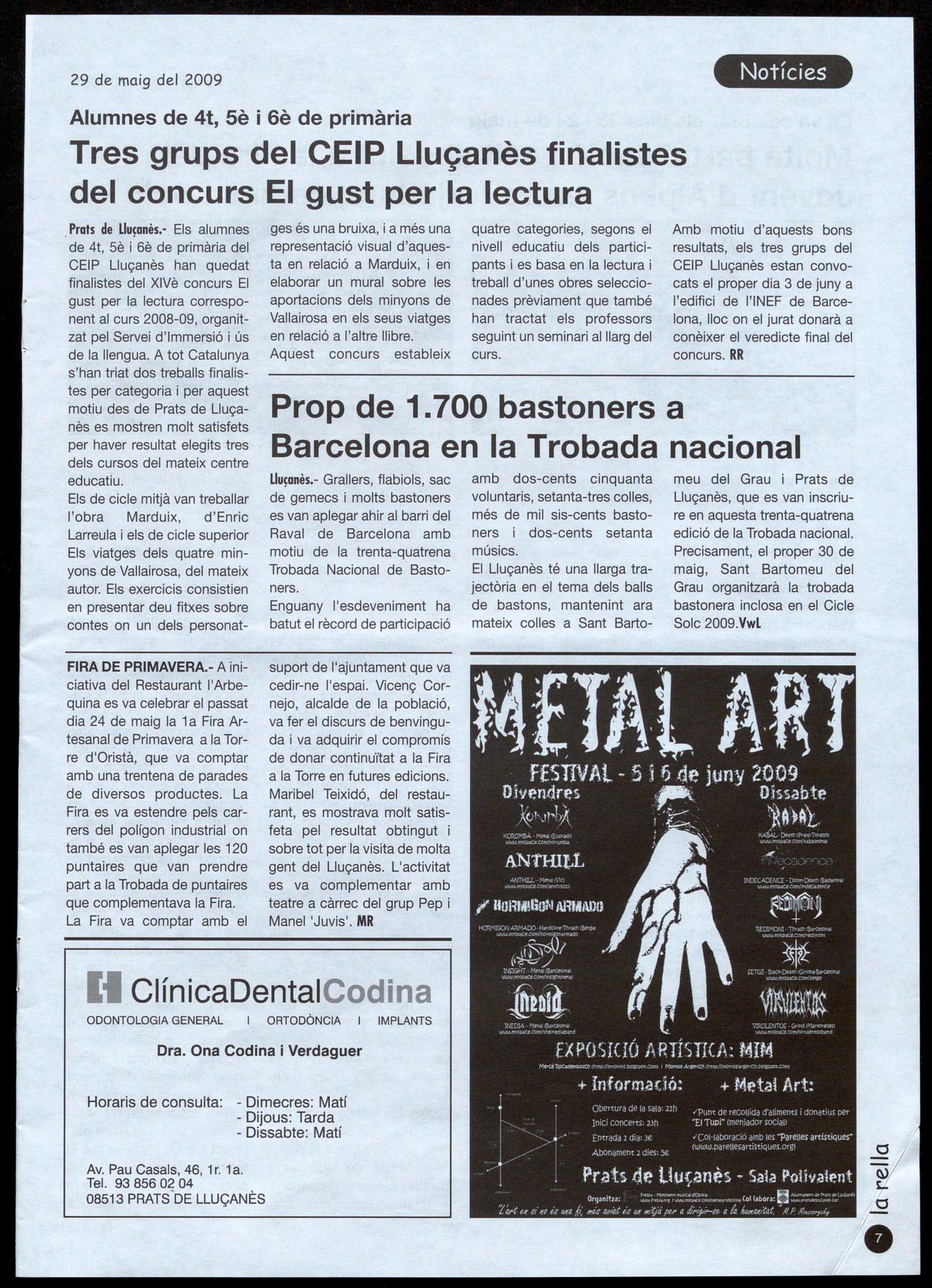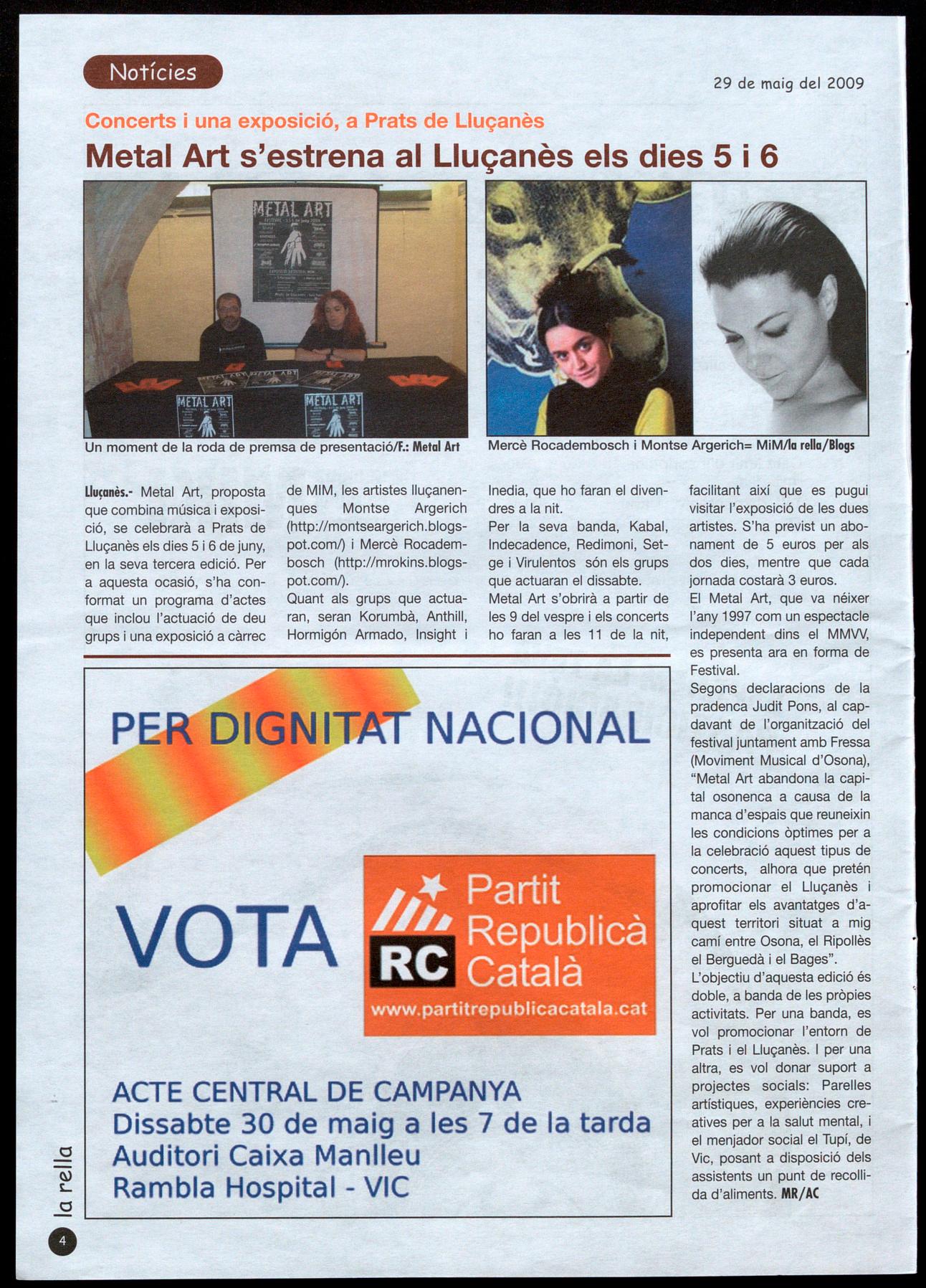 Llu�anès.- Metal Art, proposta que combina música exposició, se celebrarà a Prats de Lluçanès els dies 5 6 de juny, en la seva tercera edició. Per a aquesta ocasió, s'ha conformat un programa d'actes que inclou l'actuació de deu grups i una exposició a càrrec