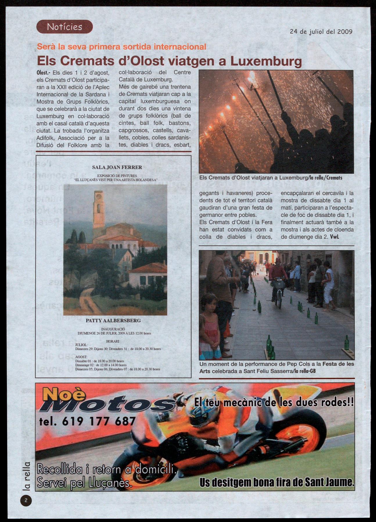 01051.- Els dies 1 i 2 d'agost, els Cremats d'Olost participaran a la XXII edició de l'Aplec Internacional de la Sardana i Mostra de Grups Folklòrics, que se celebrarà a la ciutat de Luxemburg en col-laboració amb el casal català d'aquesta ciutat. La trobada l'organitza Adifolk, Associació per a la Difusió del Folklore amb la