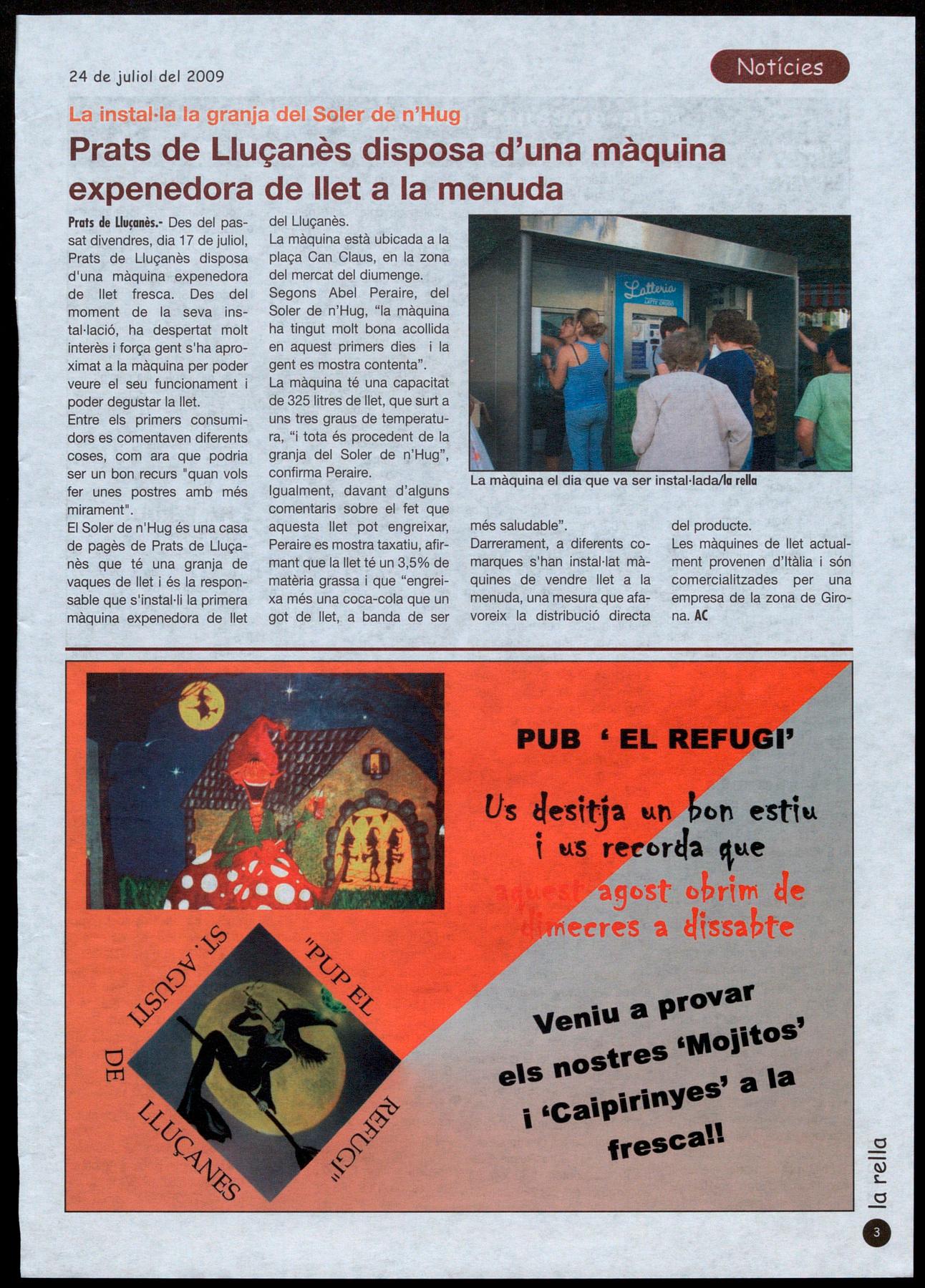 Prals de lIuçanès.- Des del passat divendres, dia 17 de juliol, Prats de Lluçanès disposa d'una màquina expenedora de llet fresca. Des del moment de la seva instal·lació, ha despertat molt interès força gent s'ha aproximat a la màquina per poder veure el seu funcionament i poder degustar la llet. Entre els primers consumidors es comentaven diferents coses, com ara que podria ser un bon recurs "quan vols fer unes postres amb més mirament".