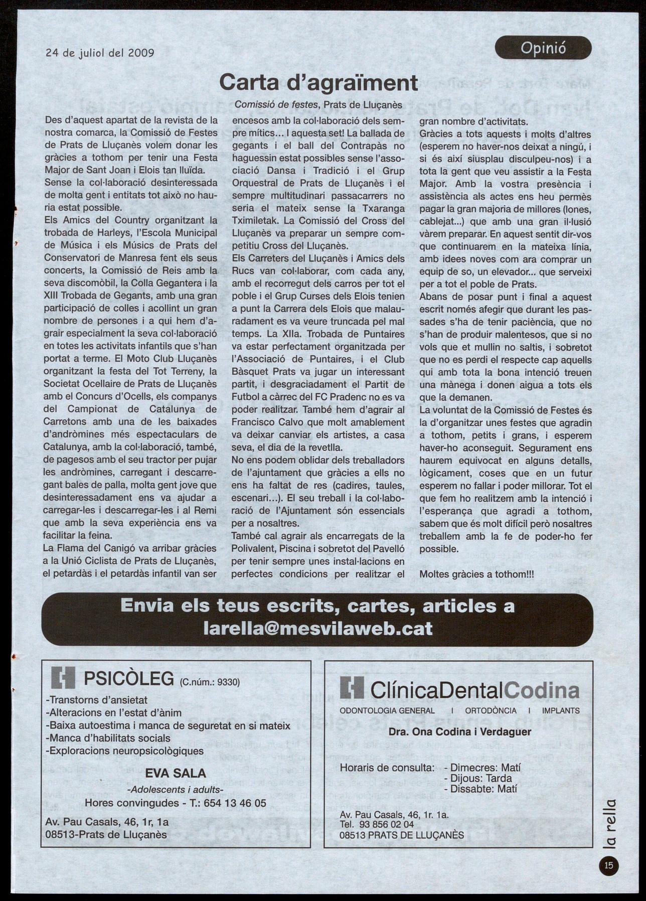Des d'aquest apartat de la revista de la nostra comarca, la Comissió de Festes de Prats de Lluçanès volem donar les gràcies a tothom per tenir una Festa Major de Sant Joan Elois tan lluïda. Sense la col-laboració desinteressada de molta gent i entitats tot això no hauria estat possible.