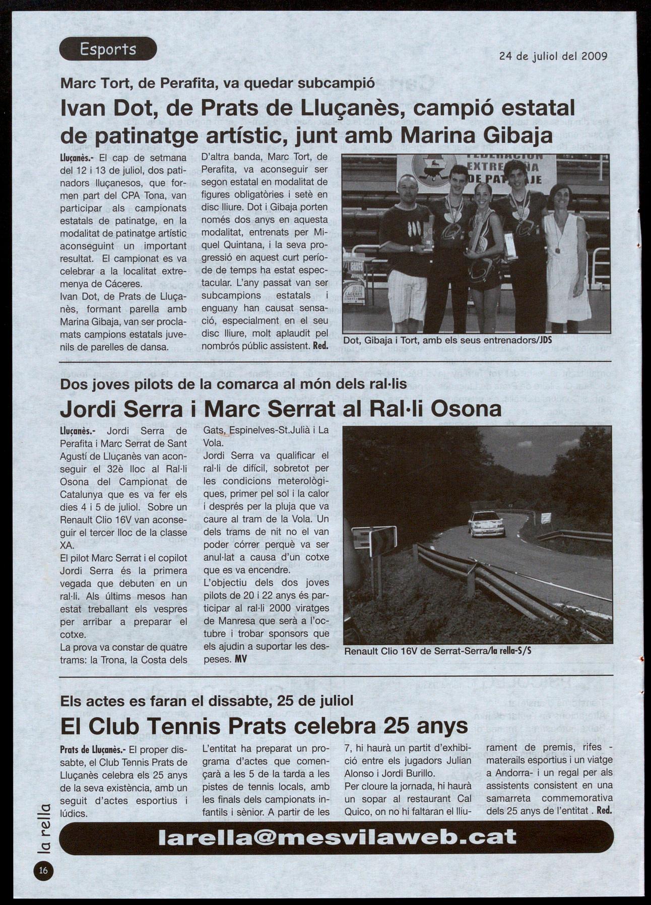 Llu�anès.- El cap de setmana del 12 i 13 de juliol, dos patinadors lluçanesos, que formen part del CPA Tona, van participar als campionats estatals de patinatge, en la modalitat de patinatge artístic aconseguint un important resultat. El campionat es va celebrar a la localitat extremenya de Cáceres.