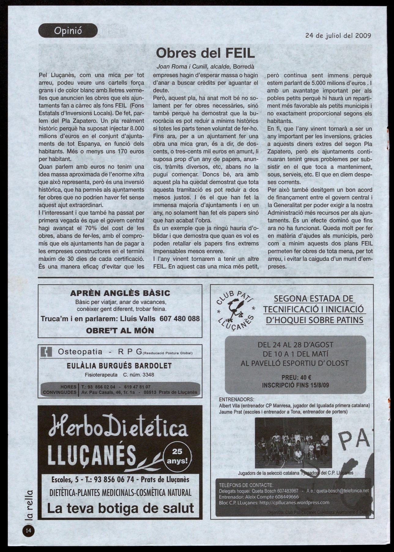 Pel Lluçanès, com una mica per tot arreu, podeu veure uns cartells força grans i de color blanc amb lletres vermelles que anuncien les obres que els ajuntaments fan acàrrec als fons FEIL (Fons Estatals d'Inversions Locals). De fet, parlem del Pla Zapatero. Un pla realment històric perquè ha suposat injectar 8.000 milions d'euros en el conjunt d'ajuntaments de tot Espanya, en funció dels habitants Més o menys uns 170 euros per habitant.