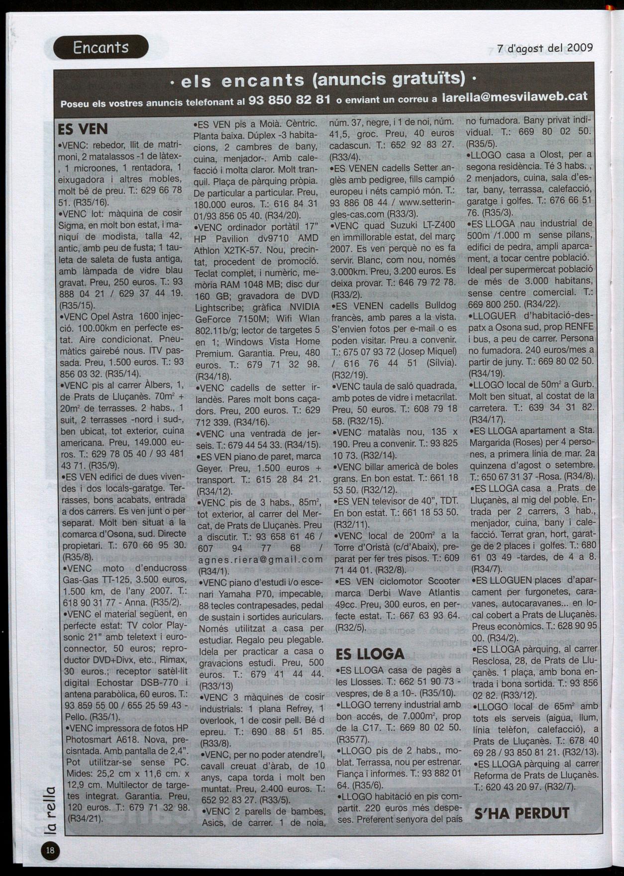 .ES LLOGA apartament a Sta Margarida (Roses) per 4 persones, a primera línia de mar. 2a quinzena d'agost o setembre T.: 6506731 37 -Rosa. (R34/8) .ES LLOGA casa a Prats de Lluçanès, al mig del poble. Entrada per 2 carrers, 3 hab., menjador, cuina, bany calefacció. Terrat gran, hort, garatge de 2 places golfes. T.: 680 61 03 49 -tardes, de 4 a 8. (R34/7).