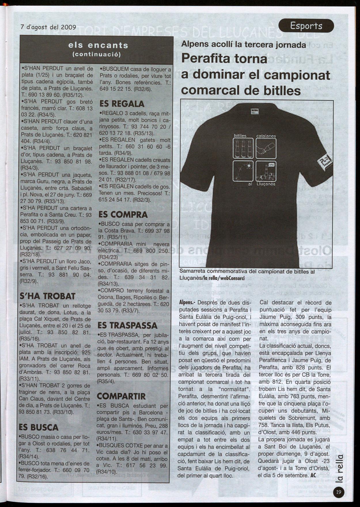 Santa Eulàlia de Puiq-oriol, havent posat de manifest l'interès creixent per a aquest joc a la comarca així com per l'augment del nivell competítiu dels grups, que havien posat en qüestió el predomini dels jugadors de Perafita, ha arribat la tercera tirada del campionat comarcal tot ha tornat a la "normalitat". Perafita, desmentint l'afirmació anterior, ha donat una lliçó de joc de bitlles i ha col·locat els dos equips als primers llocs de la jornada ha capgirat la classificació, amb un empat a tot entre els dos equips i els ha encimbellat al capdamunt de la classificació, fent baixar Lis hem dit, de Santa Eulàlia de Puig-oriol, del primer al quart lloc.