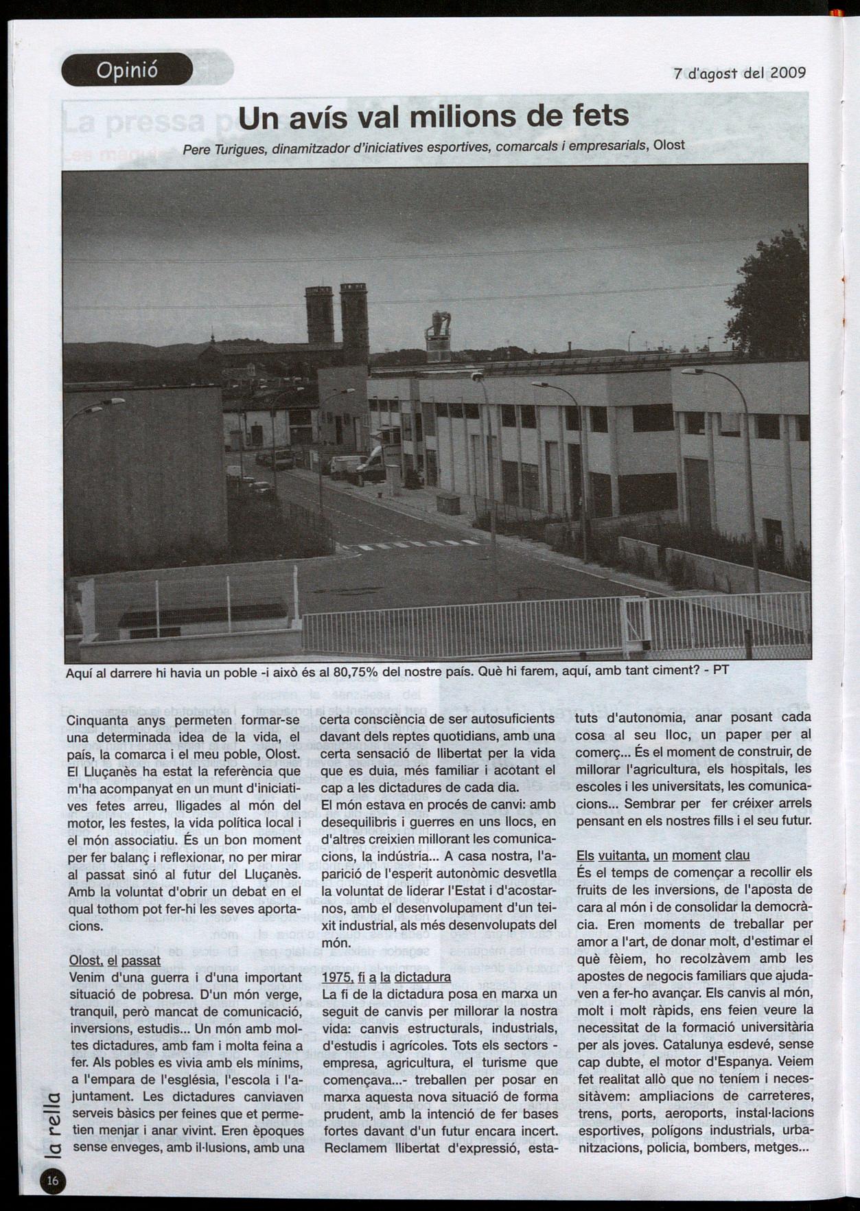 I per acabar aquestes línies parlem dels que enceten -la Festa Major: a Sant Bol.. Santi Vila, que acaba de lliurar al poble una coHecció de fòssils, serà el pregoner. A Olost segueix sent una sorpresa, i a Sant Bartomeu ho farà l'actual directora de l'escola, Teresa Feu.
