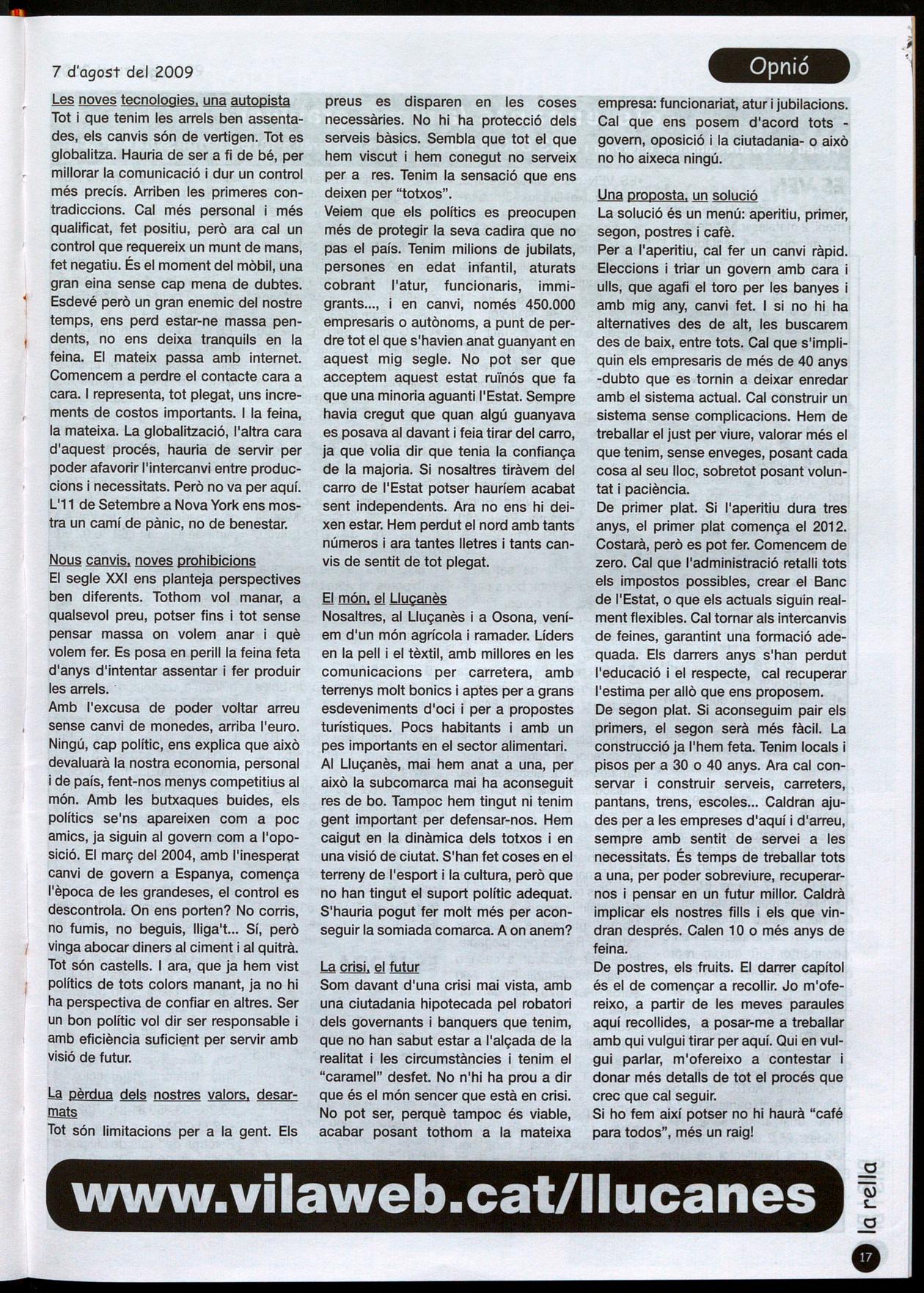 �a classificació actual, doncs, està encapçalada per Llenya Perafitenca Jaume Puig, de Perafita, amb 828 plints. El tercer lloc és per CB la Torre, amb 812. En quarta posició trobem Lis hem dit, de Santa Eulàlia, amb 763 punts, mentre que la cinquena plaça l'ocupen uns debutants, Miquelets de Sobremunt, amb 758. Tanca la llista, Els Putus, d'Olost, amb 446 punts. La propera jornada es jugarà a Sant Boi de Lluçanès, el proper diumenge, 9 d'agost. Quedarà jugar a Olost -23 d'agost- a la Torre d'Oristà, el dia 5 de setembre. AC