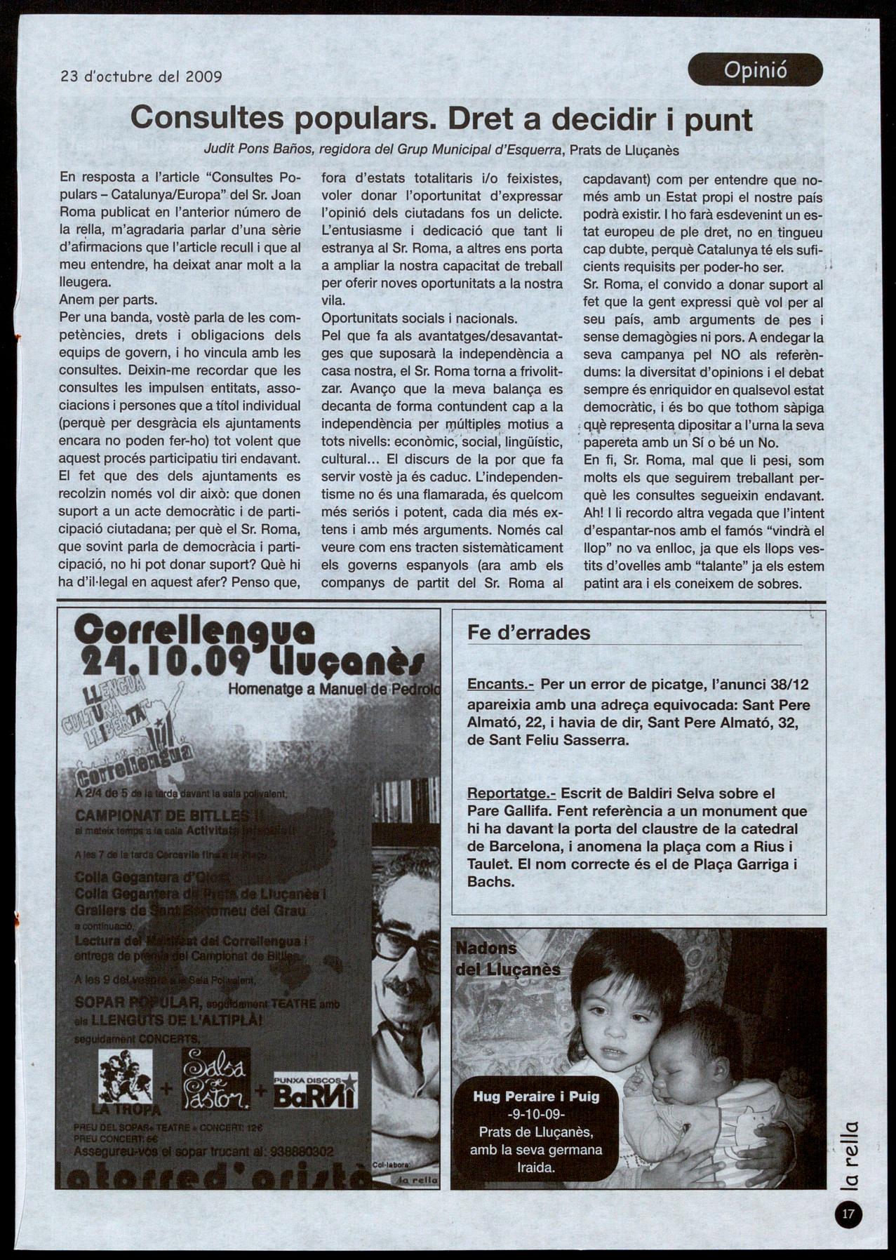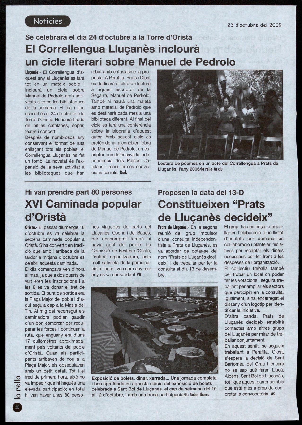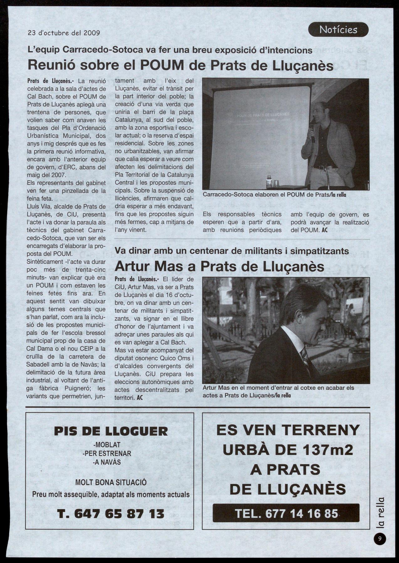Prats de Llu�anès.· El líder de CiU, Artur Mas, va ser a Prats de Lluçanès el dia 16 d'octubre, on va dinar amb un centenar de militants i simpatitzants, va signar en el llibre d'honor de l'ajuntament i va adreçar unes paraules als qui es van aplegar a Cal Bach.