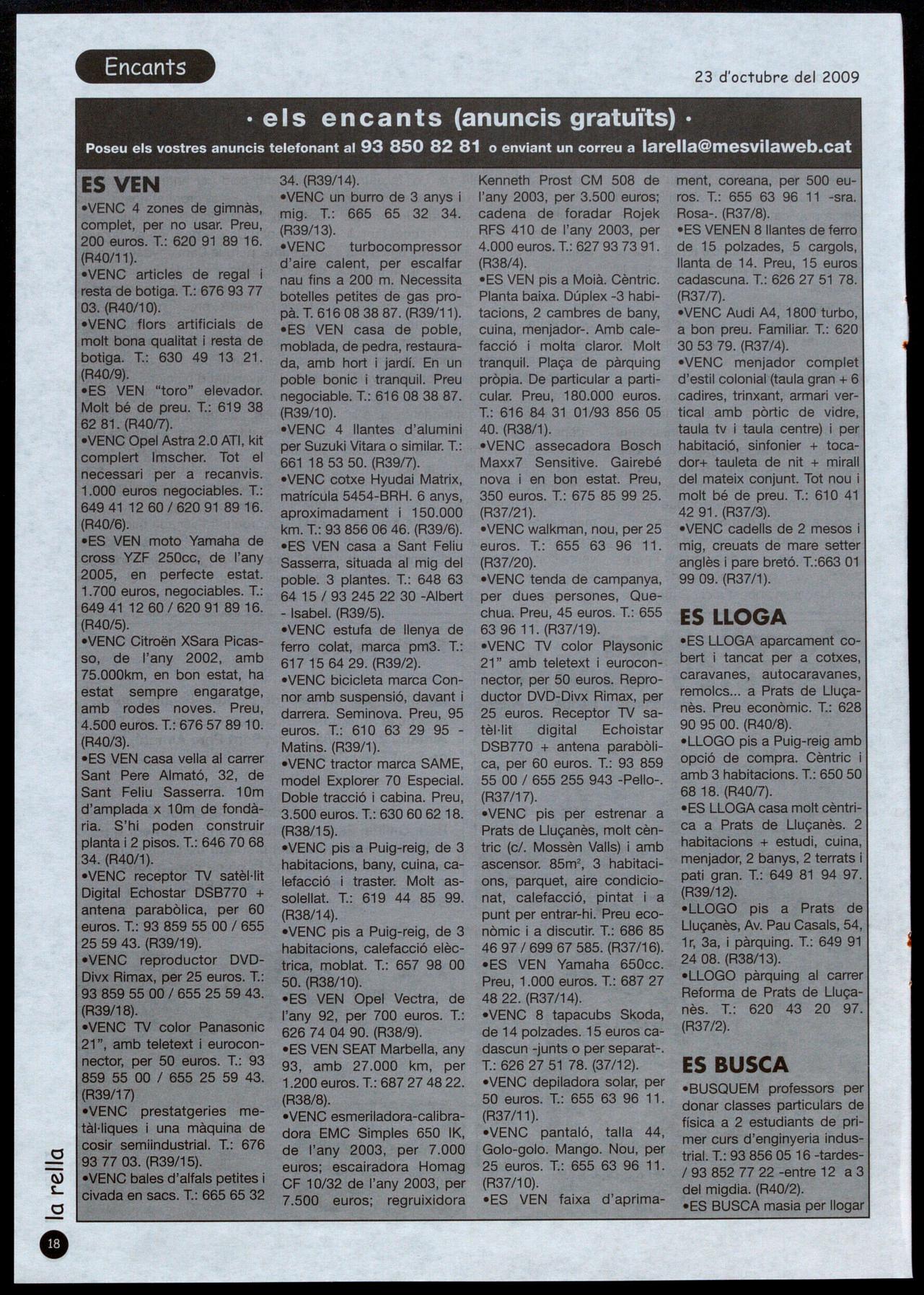 (RF/5-240) M'ofereixo per fer classes d'informàtica a particulars. 1: 695 50 58 67 (RF/4-240) S'ofereix noi de 18 anys per qualsevol tipus de feina. 1: 610 65 29 79