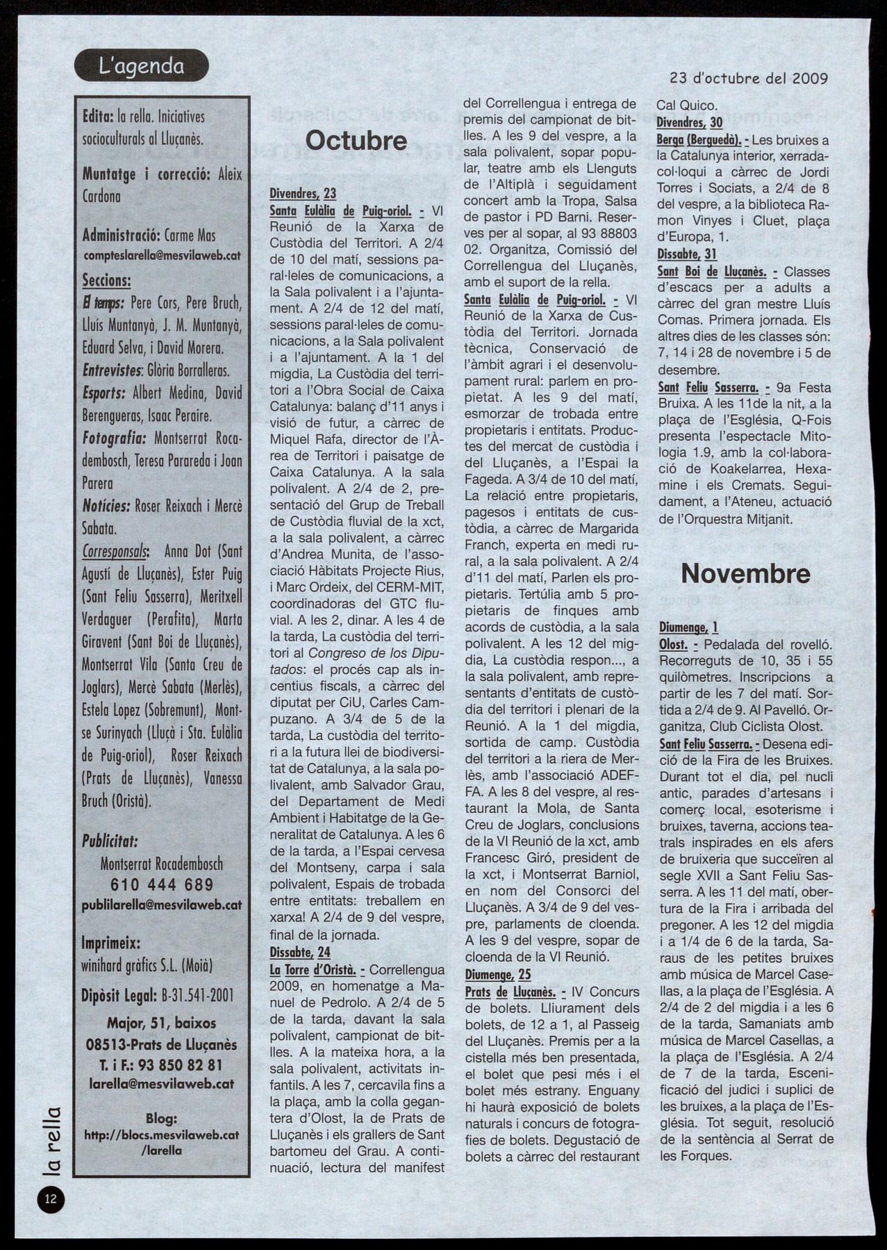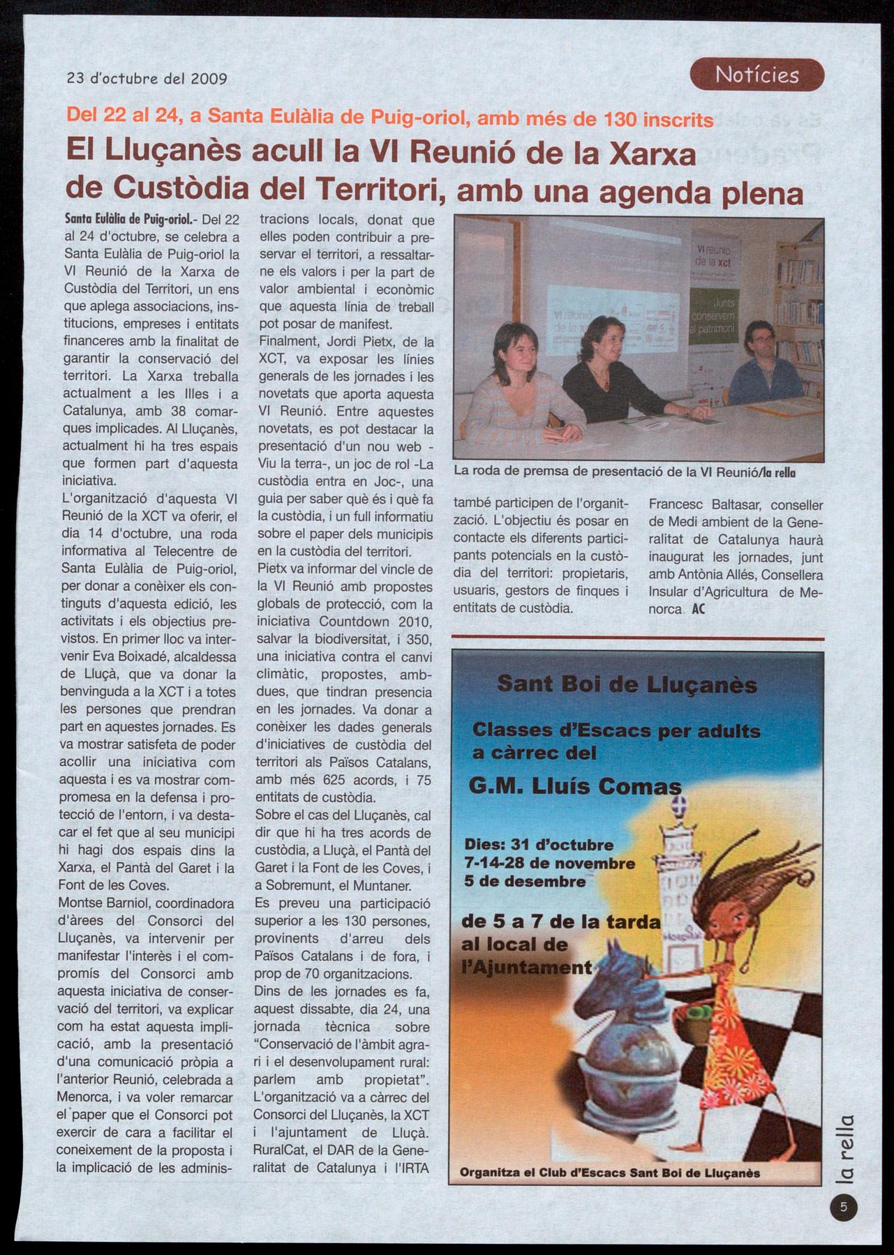 Santa Eulàlia de Puig-oriol.- Del 22 al 24 d'octubre, se celebra a Santa Eulàlia de Puig-oriol la VI Reunió de la Xarxa de Custòdia del Territori, un ens que aplega associacions, institucions, empreses entitats financeres amb la finalitat de garantir la conservació del territori. La Xarxa treballa actualment a les Illes a Catalunya, amb 38 comarques implicades. AI Lluçanès, actualment hi ha tres espais que formen part d'aquesta iniciativa.