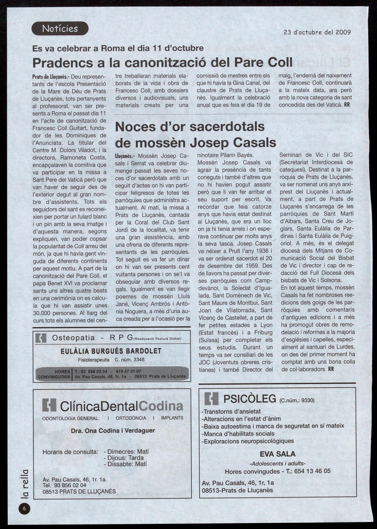 Prats de Lluçanès.- Deu representants de l'escola Presentació de la Mare de Déu de Prats de Lluçanès, tots pertanyents al professorat, van ser presents a Roma el passat dia 11 en l'acte de canonització de Francesc Coll Guitart, fundador de les Dominiques de l'Anunciata. La titular del Centre M. Dolors Viladot, la directora, Ramoneta Costa, encapçalaven la comitiva que va participar en la missa a Sant Pere del Vaticà però que van haver de seguir des de l'exterior degut al gran nombre d'assistents. Tots els seguidors del sant es reconeixien per portar un fulard blanc un pin amb la seva imatge d'aquesta manera, segons expliquen, van poder copsar la popularitat de Coll arreu del món, ja que hi havia gent vinguda de diferents continents per aquest motiu. A part de la canonització del Pare Coll, el papa Benet XVI va proclamar sants uns altres quatre beats en una cerimònia on es calcula que hi van assistir unes 30.000 persones. AI llarg del curs tots els alumnes del cen-